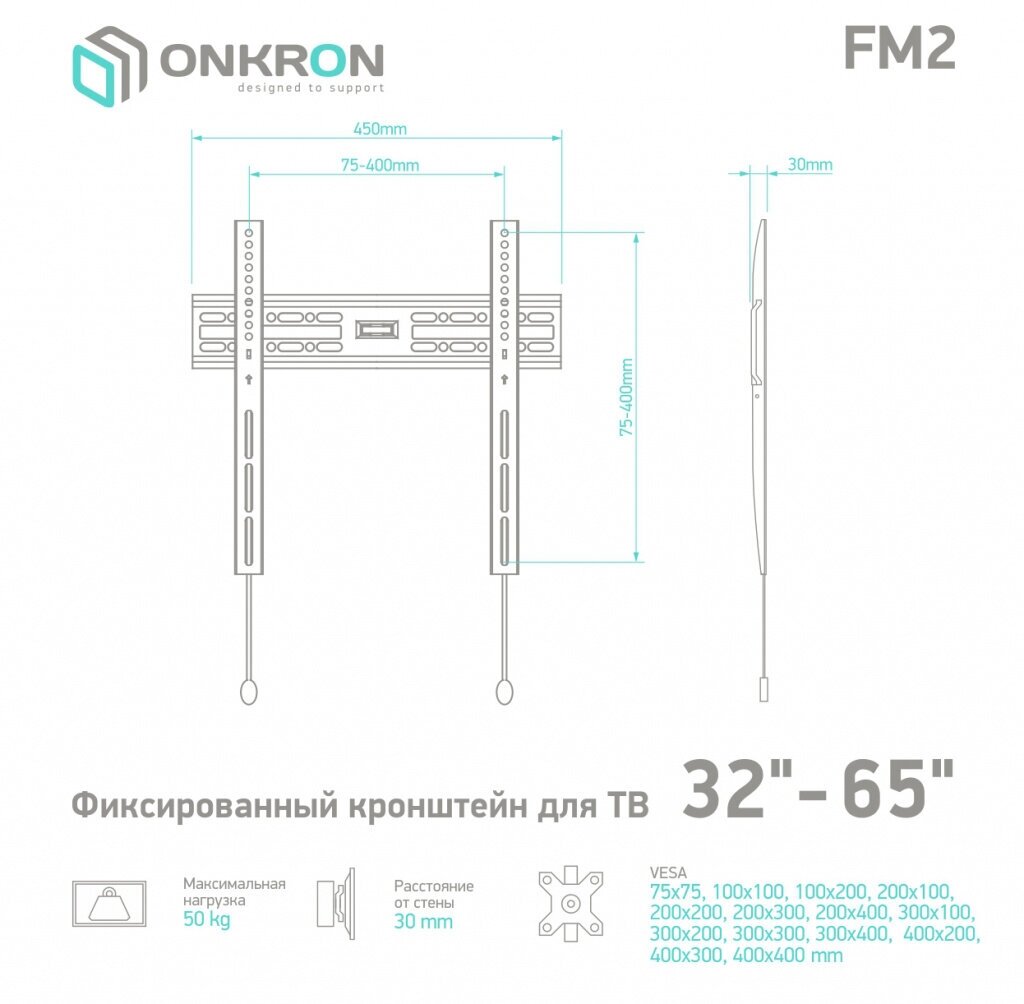 Кронштейн ONKRON FM2 / 32-55 макс. 400*400, наклон 0?, поворот 0?, от стены 30мм, вес до 50кг, черный