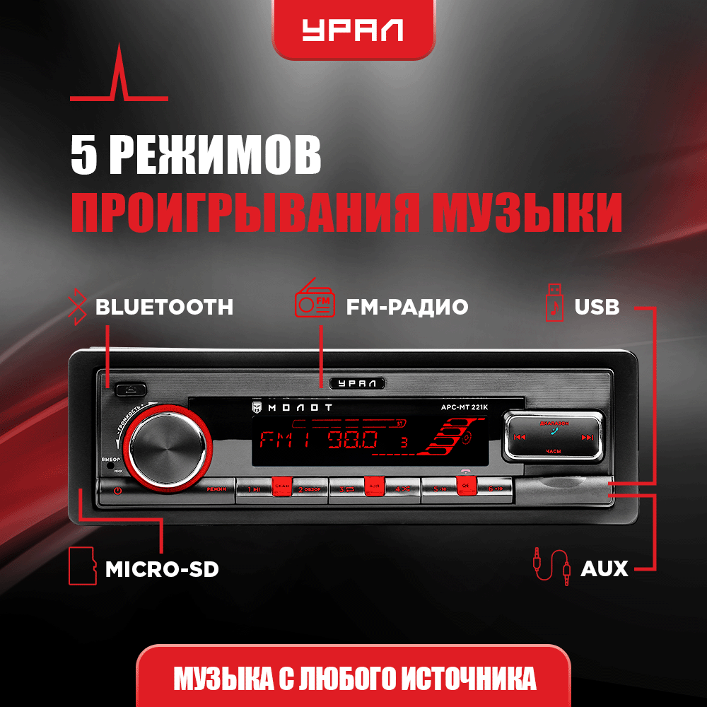 автомагнитола урал молот арс-мт 221к usb, sd/mmc,bluetooth ,красная подсветка