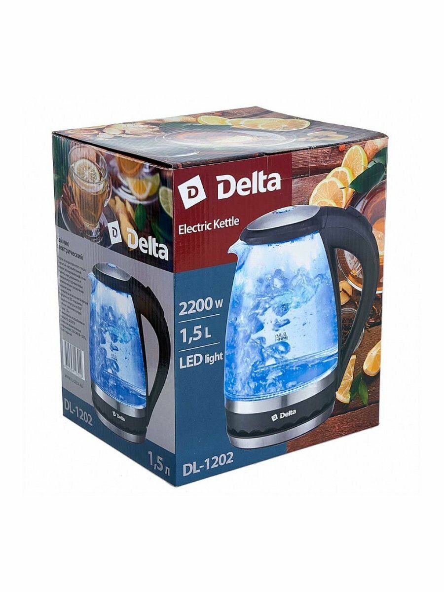 Электрочайник DELTA DL-1202, корпус из жаропр. стекла, черный: 2200 Вт, объем 1,5 литра