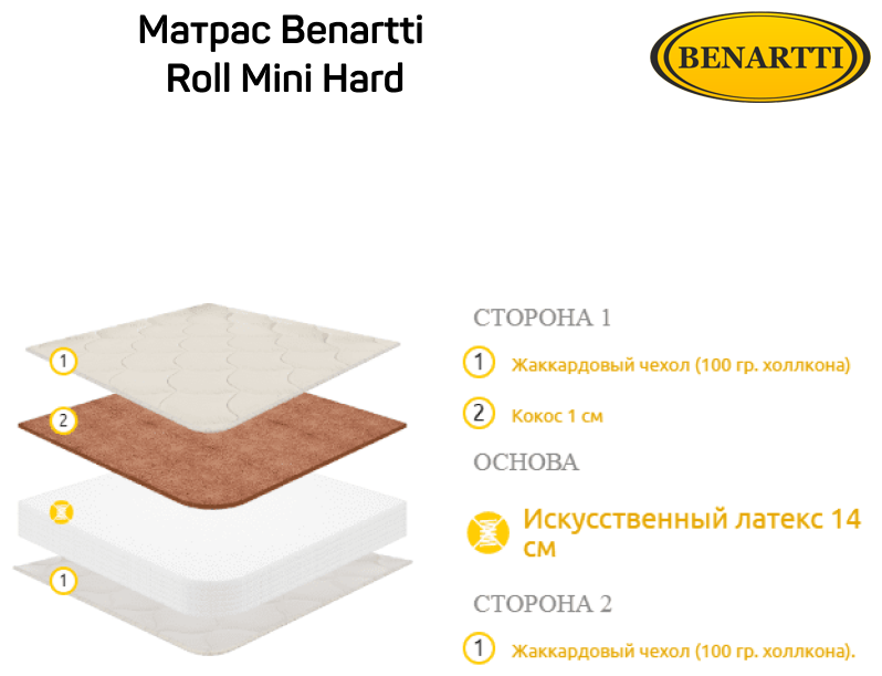 Цена для г. Баштанка. Матрас Benartti Roll Mini Hard. Матрас Roll Mini Hard с разными сторонами жесткости, общая высота 15 см. Максимально допустимая нагрузка на одно спальное место до 120 кг. Матрас является беспружинным, основой служит экологически чистый материал выше средней жесткости искусственный латекс высотой 14 см. С одной стороны добавлен слой латексированной кокосовой койры, что придает дополнительную жесткость и долговечность матрасу. Магазины в городе Баштанка смотрите ниже