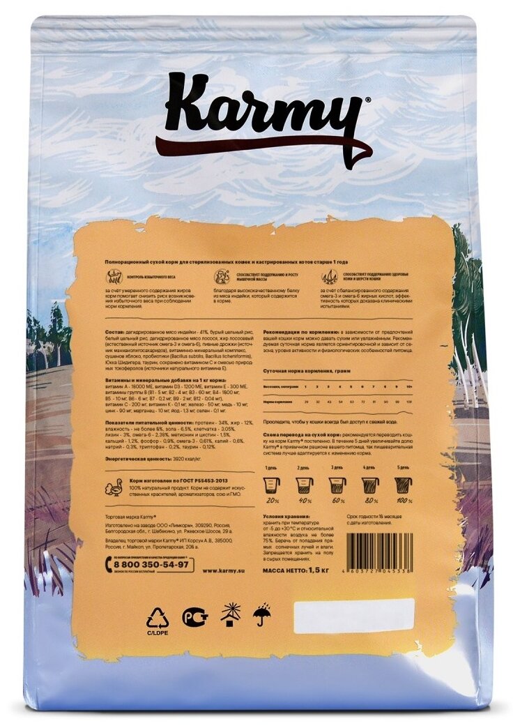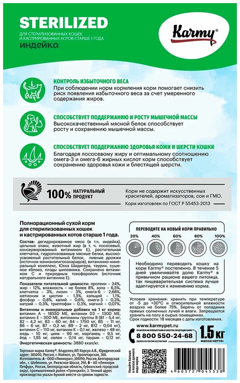 KARMY STERILIZED, сухой корм для стерилизованных кошек и кастрированных котов, со вкусом индейки, 1,5 кг*