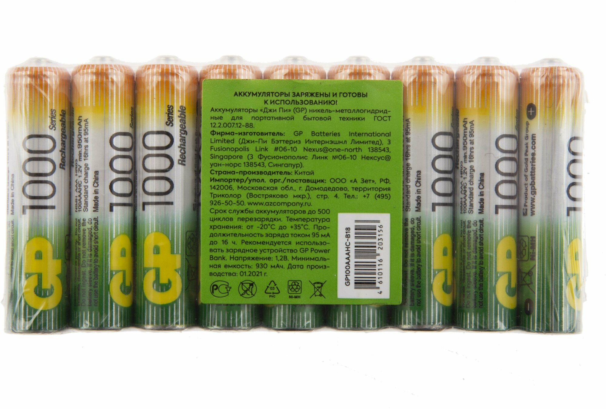 GP Перезаряжаемые аккумуляторы 100AAAHC AAA, емкость 1000 мАч - 8 шт. 100AAAHC4/4-2CR8 GP 100AAAHC4/4-2CR8