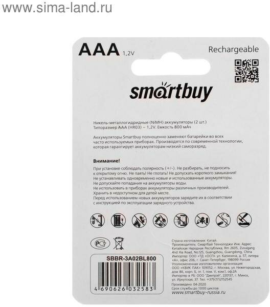 Аккумулятор Smartbuy SBBR-3A02BL800 (1.2v, 800mAh) NiMh, Size "aaa" (уп. 2 шт)