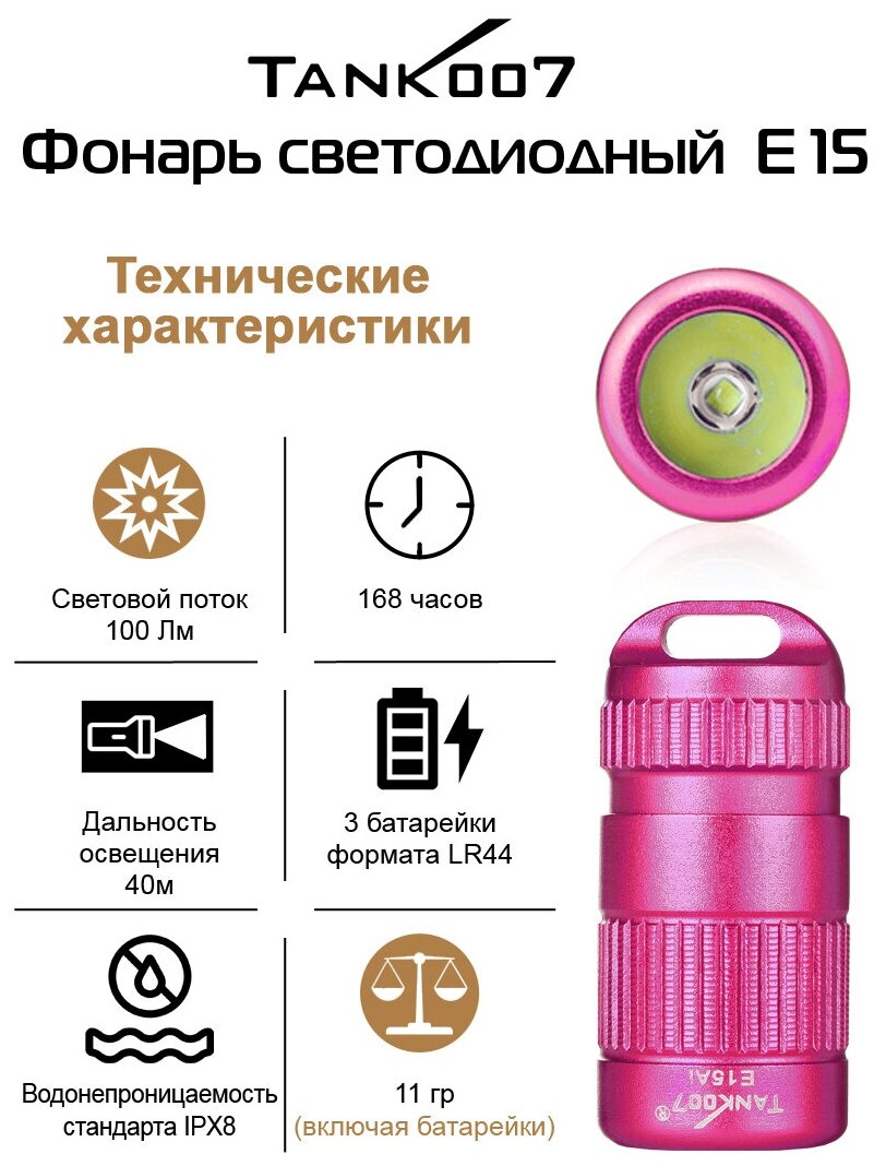 Tank007 TANK007 Светодиодный фонарь с комплектацией, Розовый E15pink фонарики в Борисполь