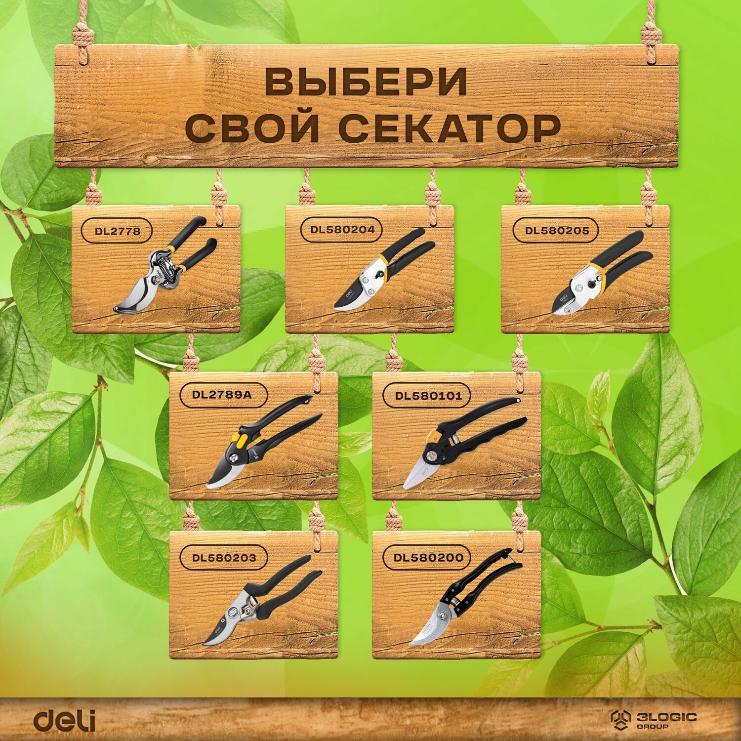 Секатор Deli DL580200, сталь 65 MN, черный/серебристый