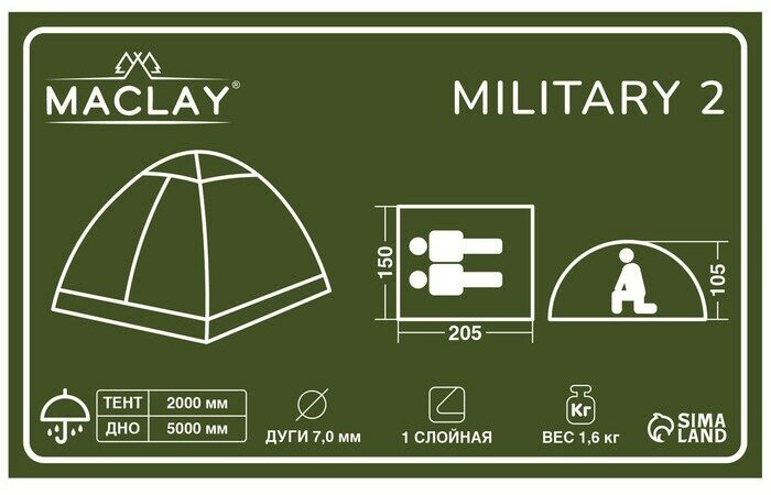 Палатка Maclay "MILITARY 2 ", туристическая, размер 205 х 150 х 105 см, двухместная