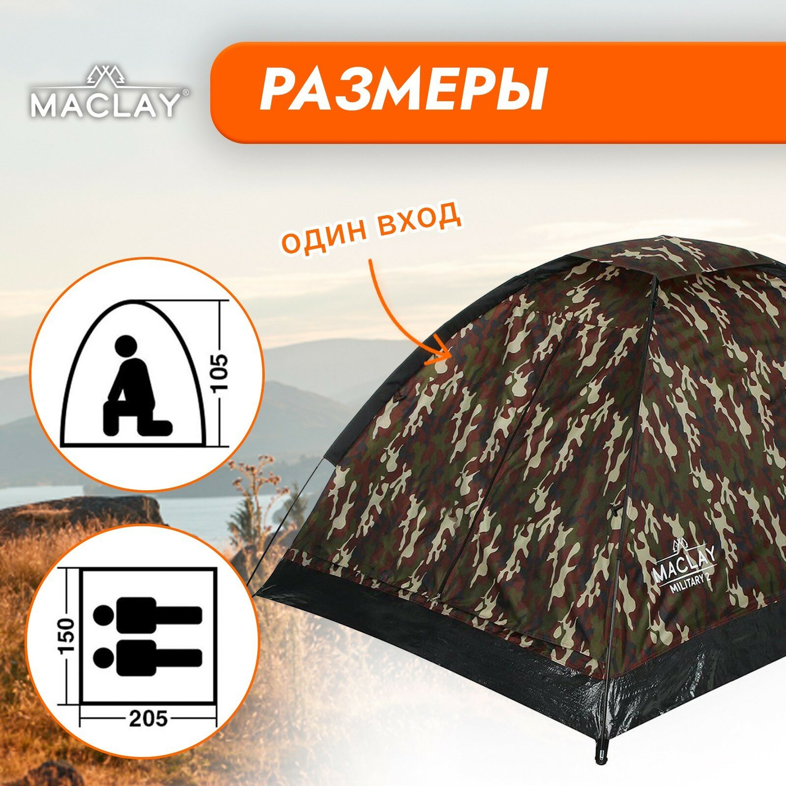 Палатка туристическая MILITARY 2, р. 205 х 150 х 105 см, 2-местная, однослойная