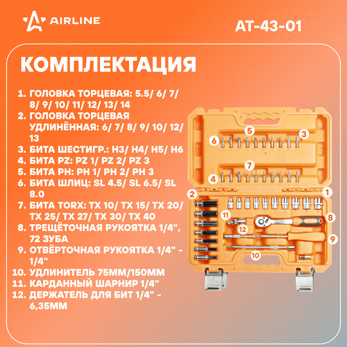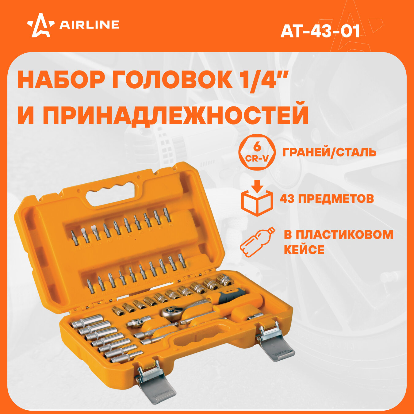 AIRLINE Набор Головок И Принадлежностей 1/4 43Пр. Пласт.кейс (At-43-01) AIRLINE арт. at-43-01 набор инструментов в Борисполь