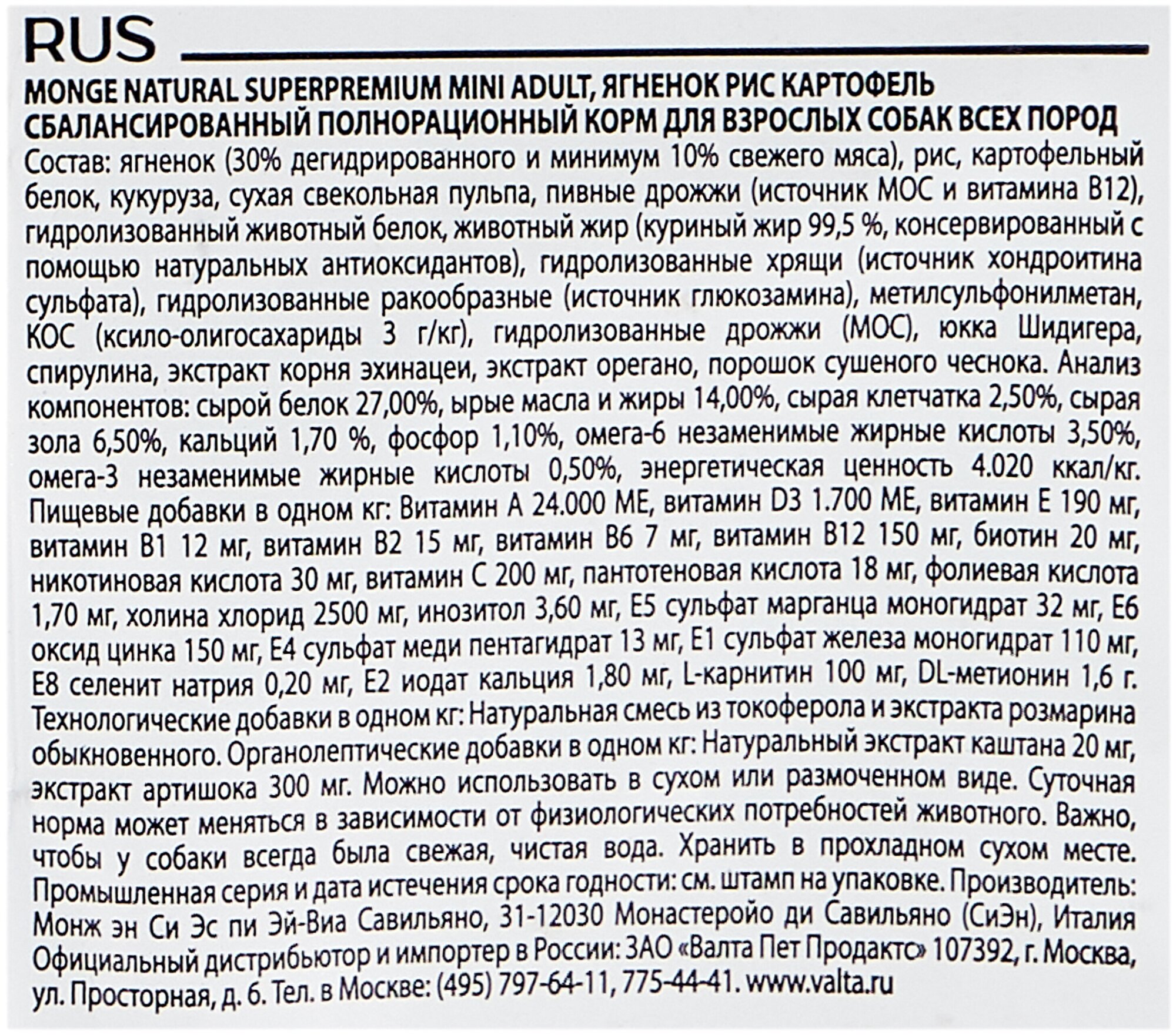 MONGE SPECIALITY DOG MINI ADULT LAMB для взрослых собак маленьких пород с ягненком, рисом и картофелем (7,5 кг)