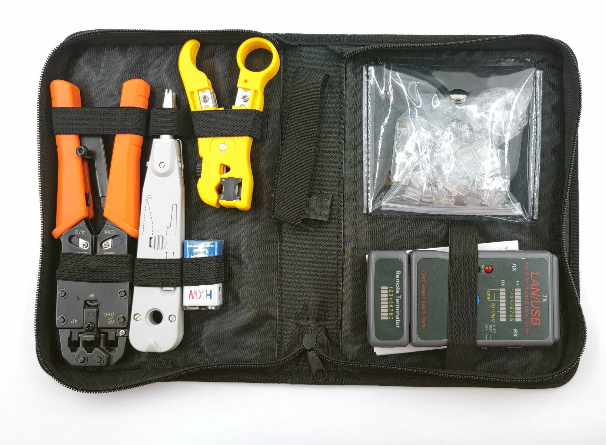 - коннектор RJ45 (20 шт), тестер кабеля, клещи обжимные, нож KRONE (батарейка 9В, переходник (2 шт))