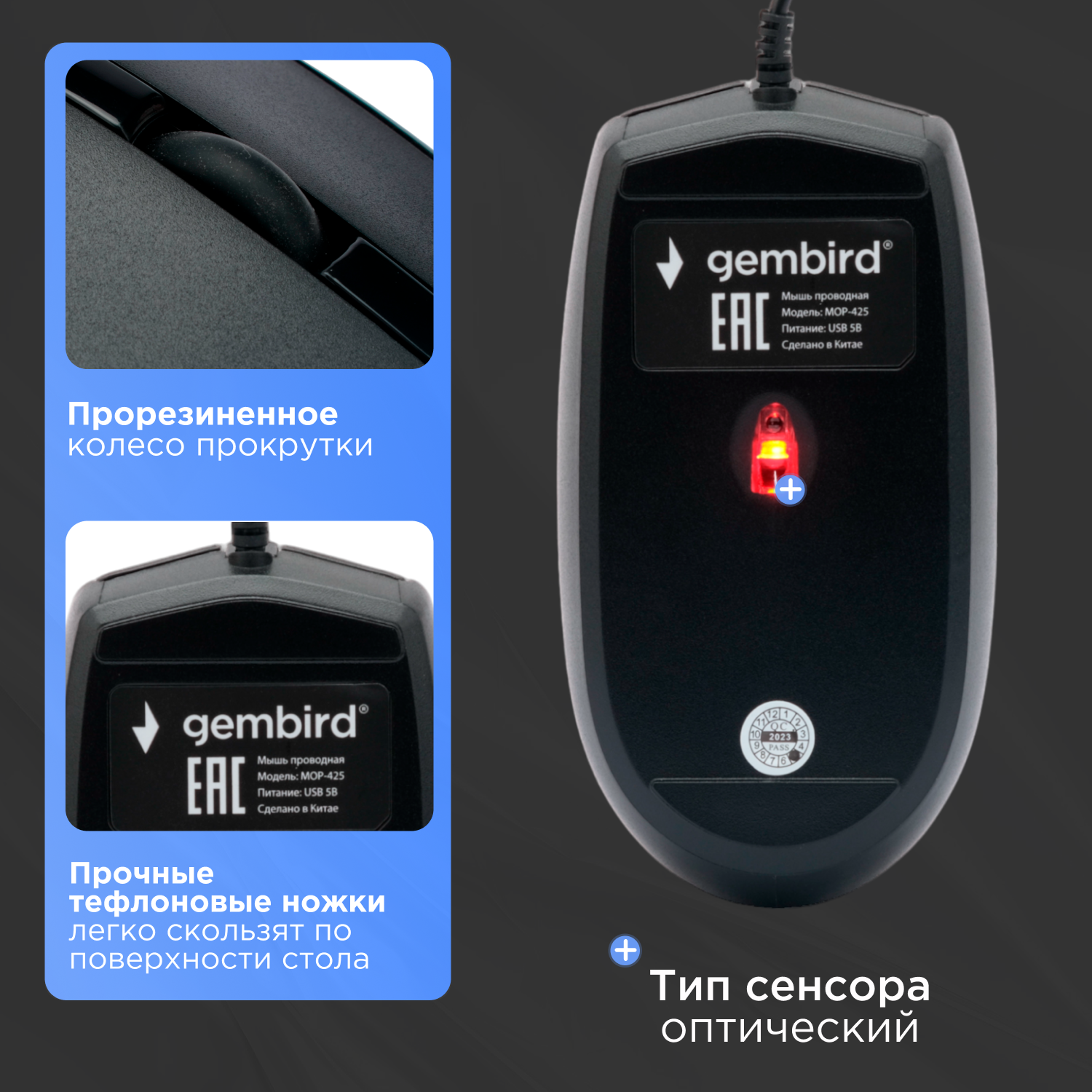 Мышь компьютерная Gembird MOP-425, USB, черный, 2кн.+колесо, 1000 DPI, 1.8м