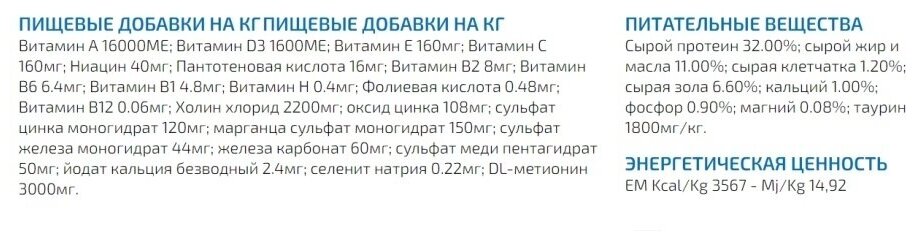 Цена для г. Борисполь. Ингредиенты Дегидратированная рыба (лосось 10%, тунец 10%), рис (20%), дегидратированное куриное мясо, кукуруза, куриный жир, гидролизат животных белков, пульпа сахарной свеклы, рыбий жир, растительное масло, кукурузный глютен, дегидратированные цельные яйца, хлорид натрия, хлорид калия, сульфат кальция, сухие пивные дрожжи. Пищевые добавки на КГ Витамин А 16000МЕ; Витамин D3 1600МЕ; Витамин Е 160мг; Витамин С 160мг; Ниацин 40мг; Пантотеновая кислота 16мг; Витамин В2 8мг; Витамин В6 6.4мг; Витамин В1 4.8мг. Магазины в городе Борисполь смотрите ниже