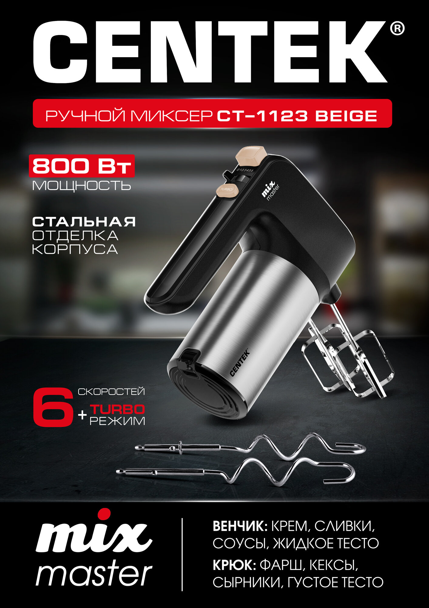 Миксер Centek CT-1123 (Beige) 800Вт, 6 скоростей +турбо, взбивание/замешивание CT-1123 Beige .