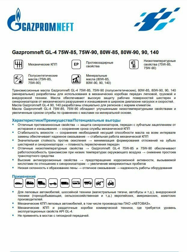 Масло Gazpromneft 80w85 Gl-4 4л Транс Gazpromneft арт. 2389901366