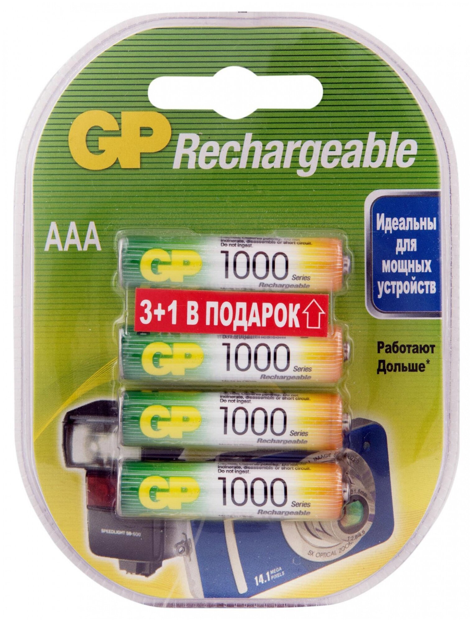 Аккумулятор GP, Ni-Mh, AAA, HR03-4BL, 1.2В, 1000 мАч, блистер, 3+1 шт. GP 1065392