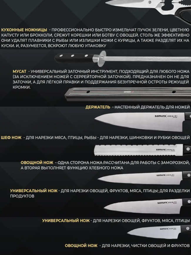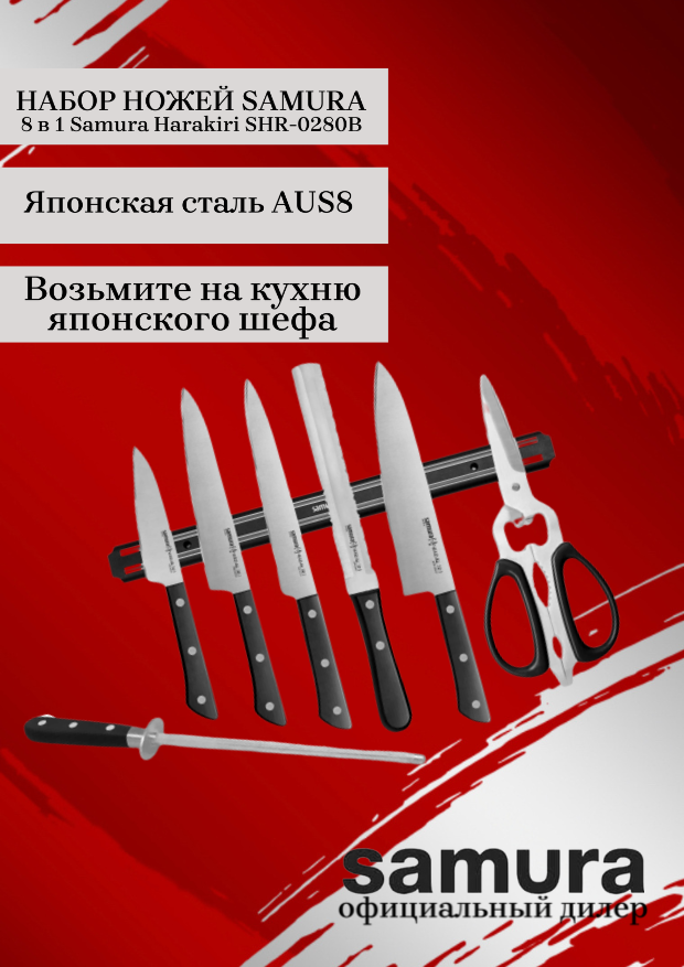 Цена для г. Борисполь. Фирменный супер-сет Harakiri от компании Samura представляет многофункциональный комплект из 5-ти ножей, магнитного держателя, ножниц и мусата для заточки. Характеристики: * Фирменный супер-сет harakiri от компании samura представляет многофункциональный комплект из 5-ти ножей, магнитного держателя, ножниц и мусата для заточки * Возможности этого суперсета охватывают весь необходимый на кухне спектр действий. Они позволяют без проблем работать практически с любыми продуктами. Магазины в городе Борисполь смотрите ниже