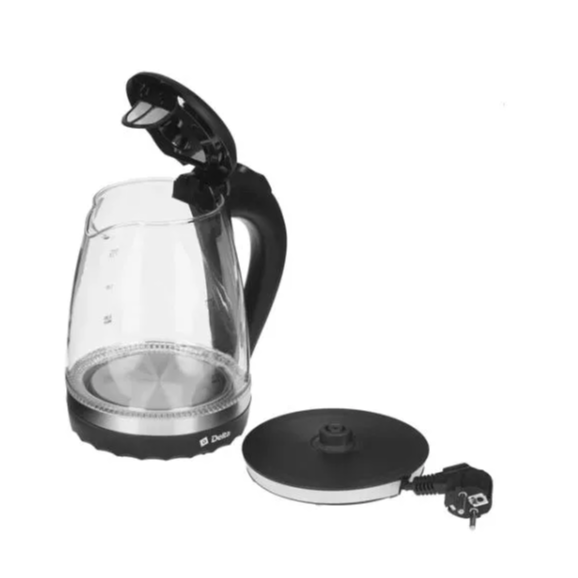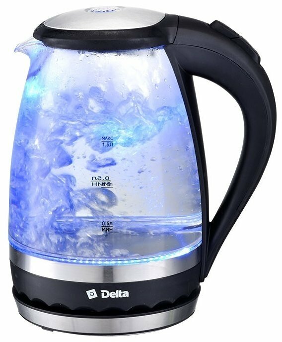 Электрочайник DELTA DL-1202, корпус из жаропр. стекла, черный: 2200 Вт, объем 1,5 литра