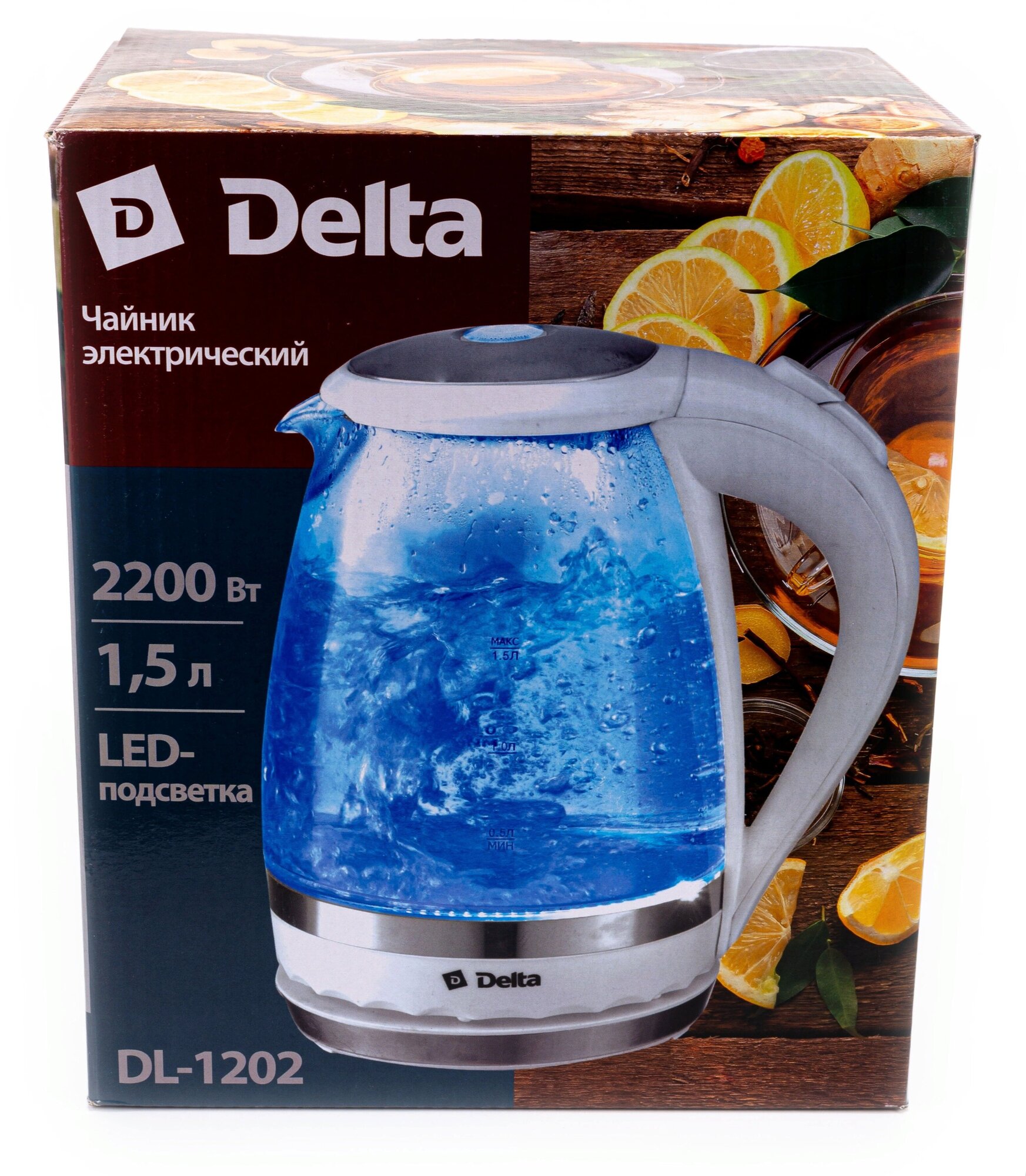 Электрочайник DELTA DL-1202, корпус из жаропр. стекла, черный: 2200 Вт, объем 1,5 литра