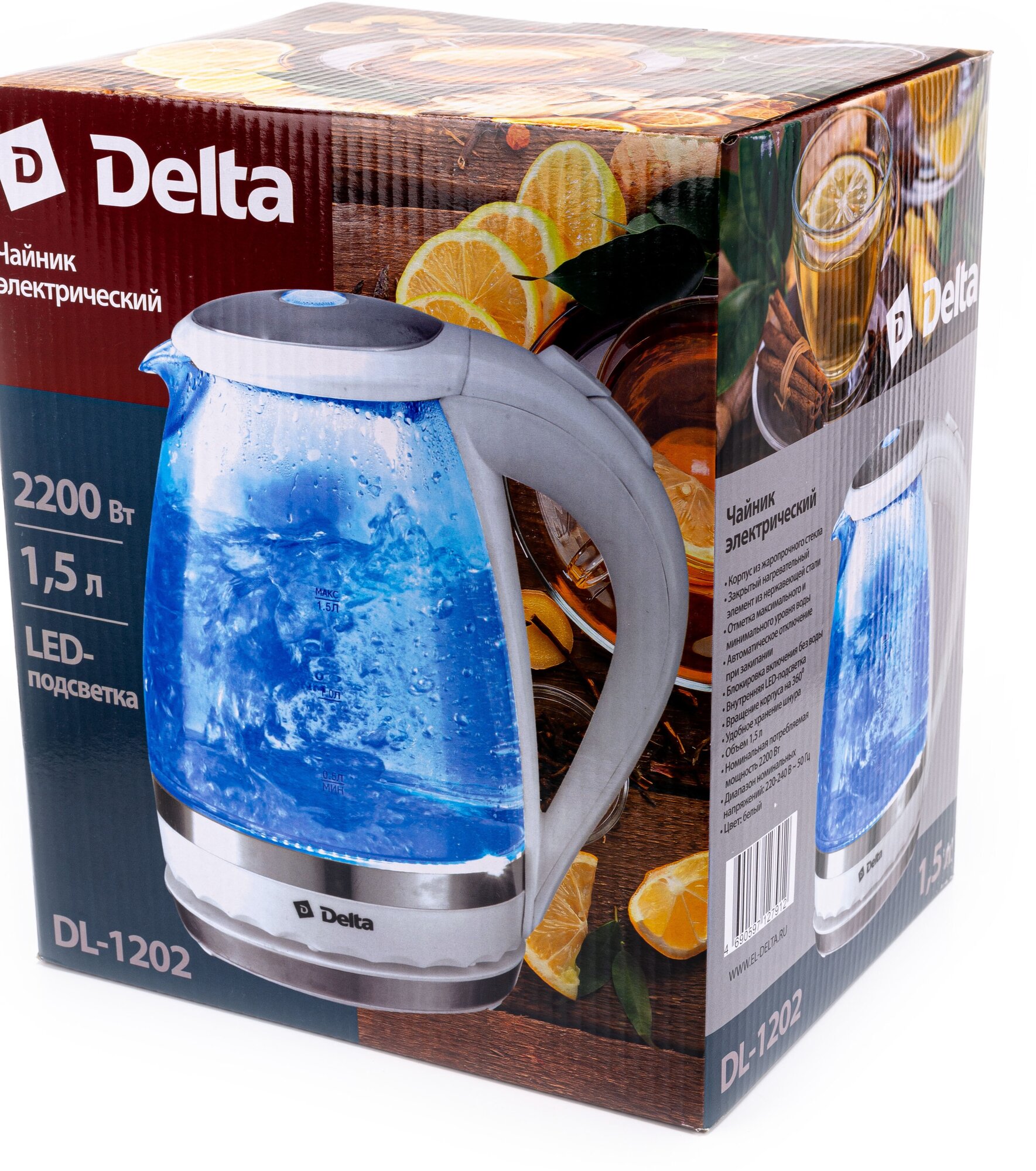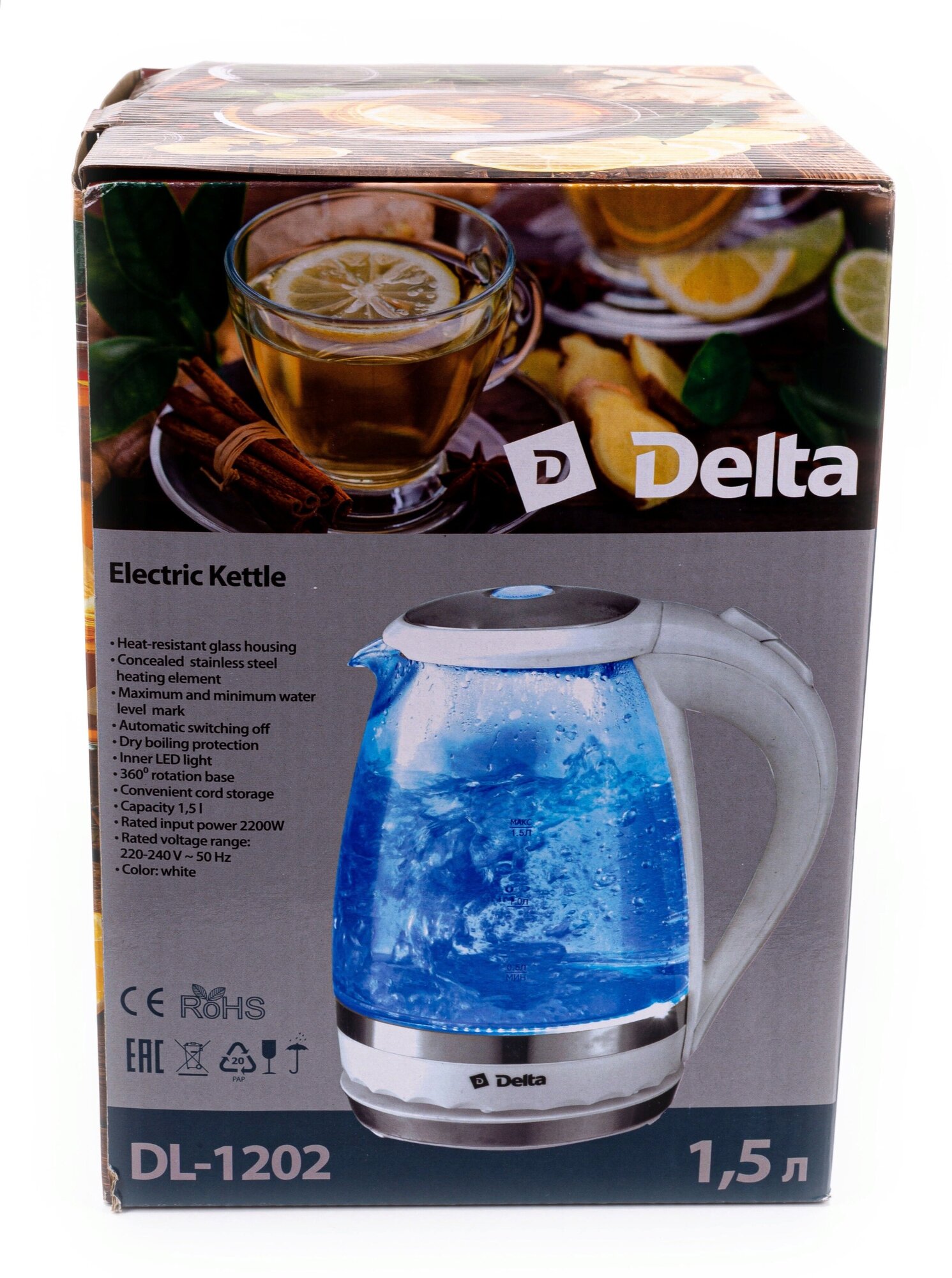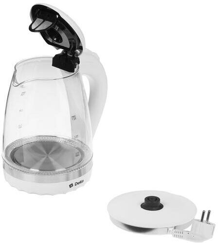 Электрочайник DELTA DL-1202, корпус из жаропр. стекла, белый: 2200 Вт, объем 1,5 литра