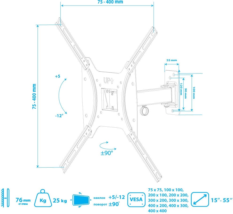 Цена для г. Борисполь. Кронштейн для LED/LCD телевизоров 15"-55", max 25 кг, настенный, 3 ст свободы, наклон +5°-12°, поворот ±90°, от стены 68.5-225 мм, max VESA 400x400 мм, съемная монтажная пластина, кабель-канал. Магазины в городе Борисполь смотрите ниже