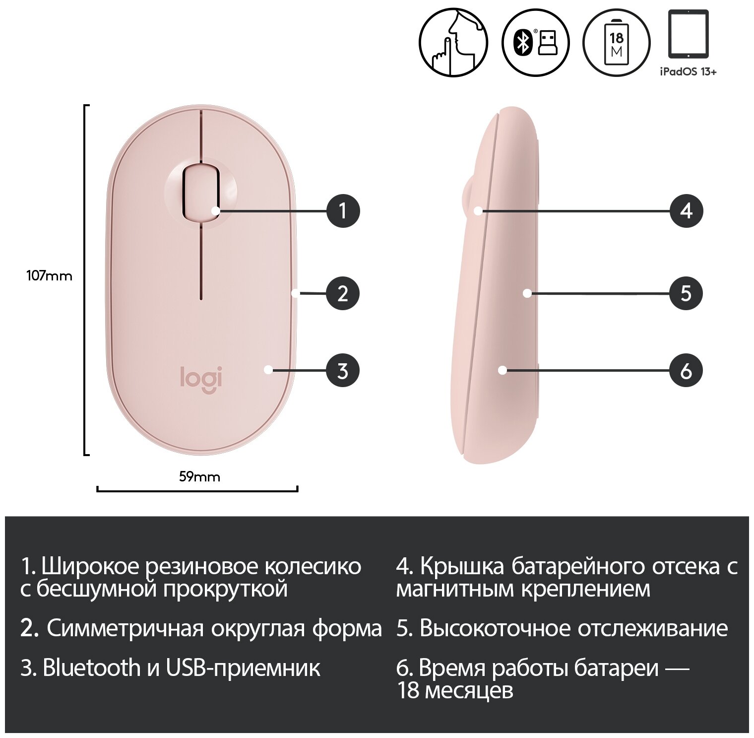 Мышь Logitech Pebble M350, беспроводная, оптическая, 1000 dpi, розовая 10423164 .