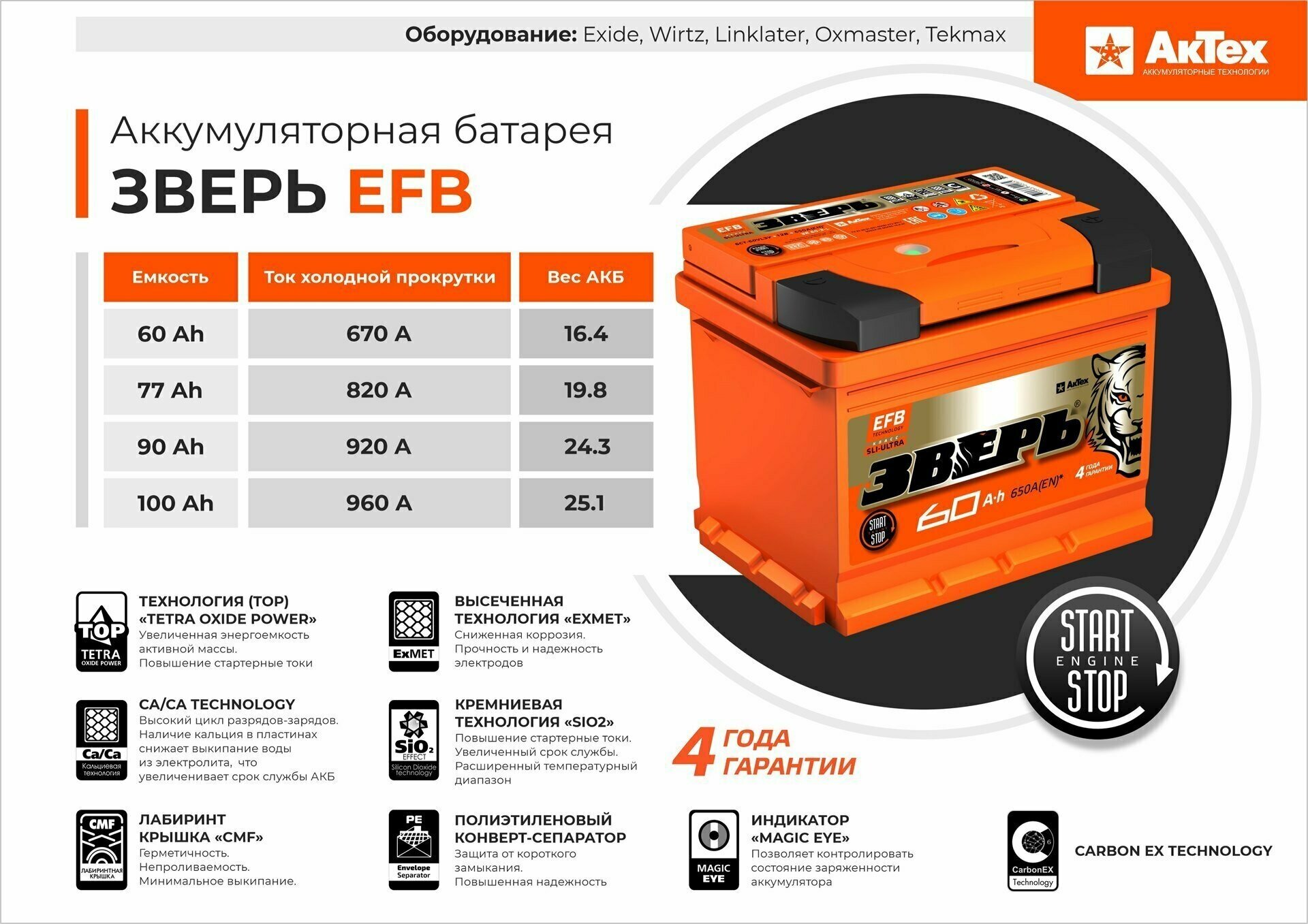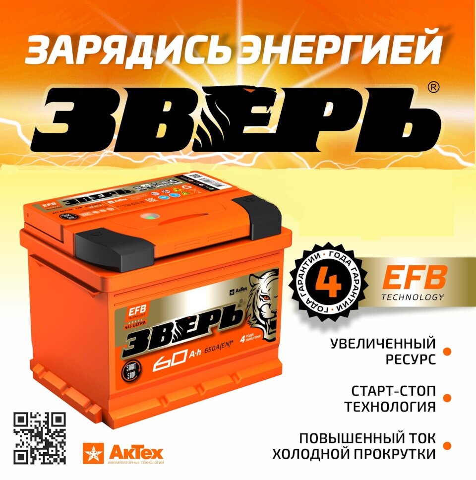 Зверь ZVEFB 60-3-R Аккумулятор зверь EFB 60 А/ч обратная R+ 242x175x190 EN640 А