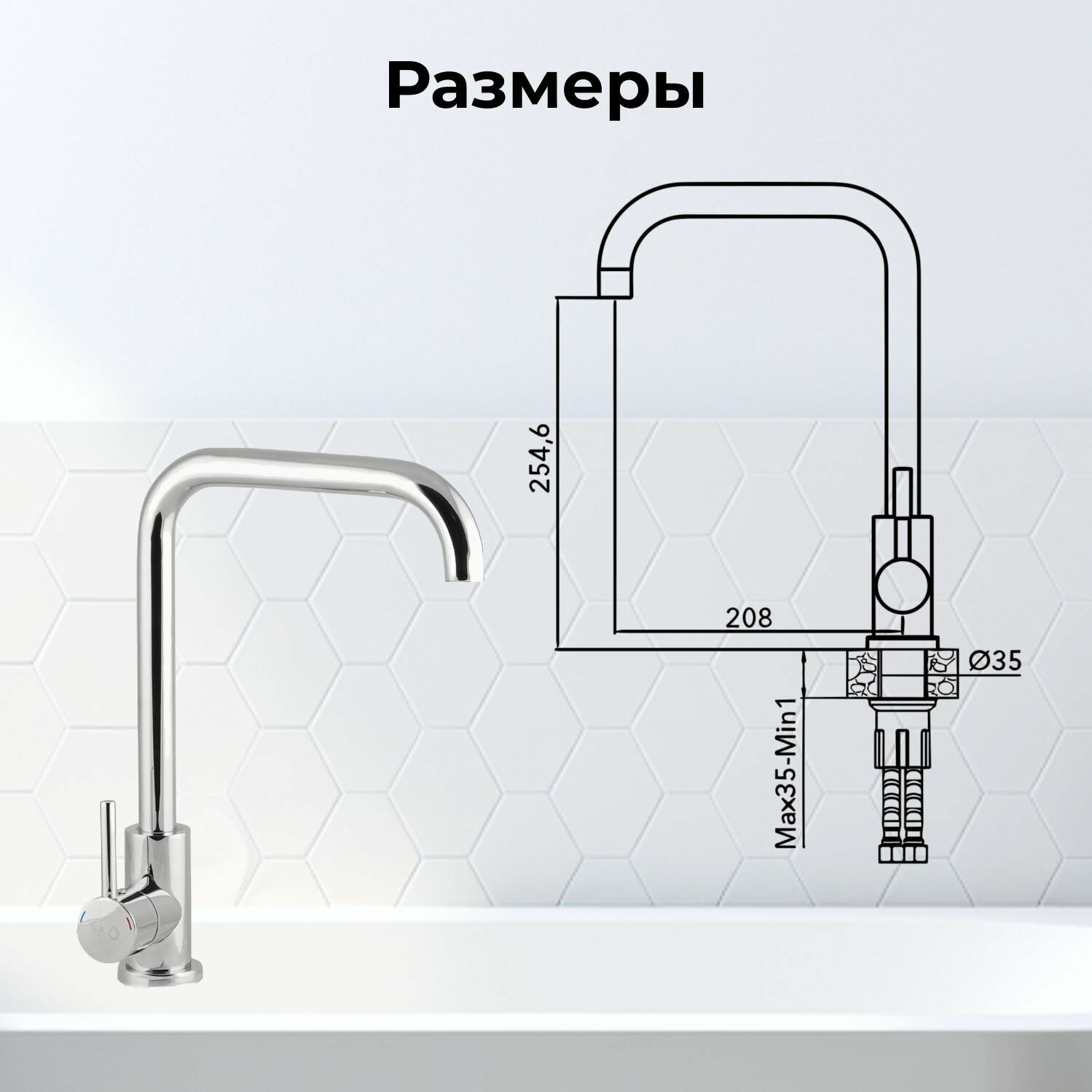 Смеситель для кухни (SUS 304) D35 AVZAR4-B304CH хром AV Engineering (Поворотный излив, длина 21 см, высота 25 см) (AVZAR4-B304CH-735)