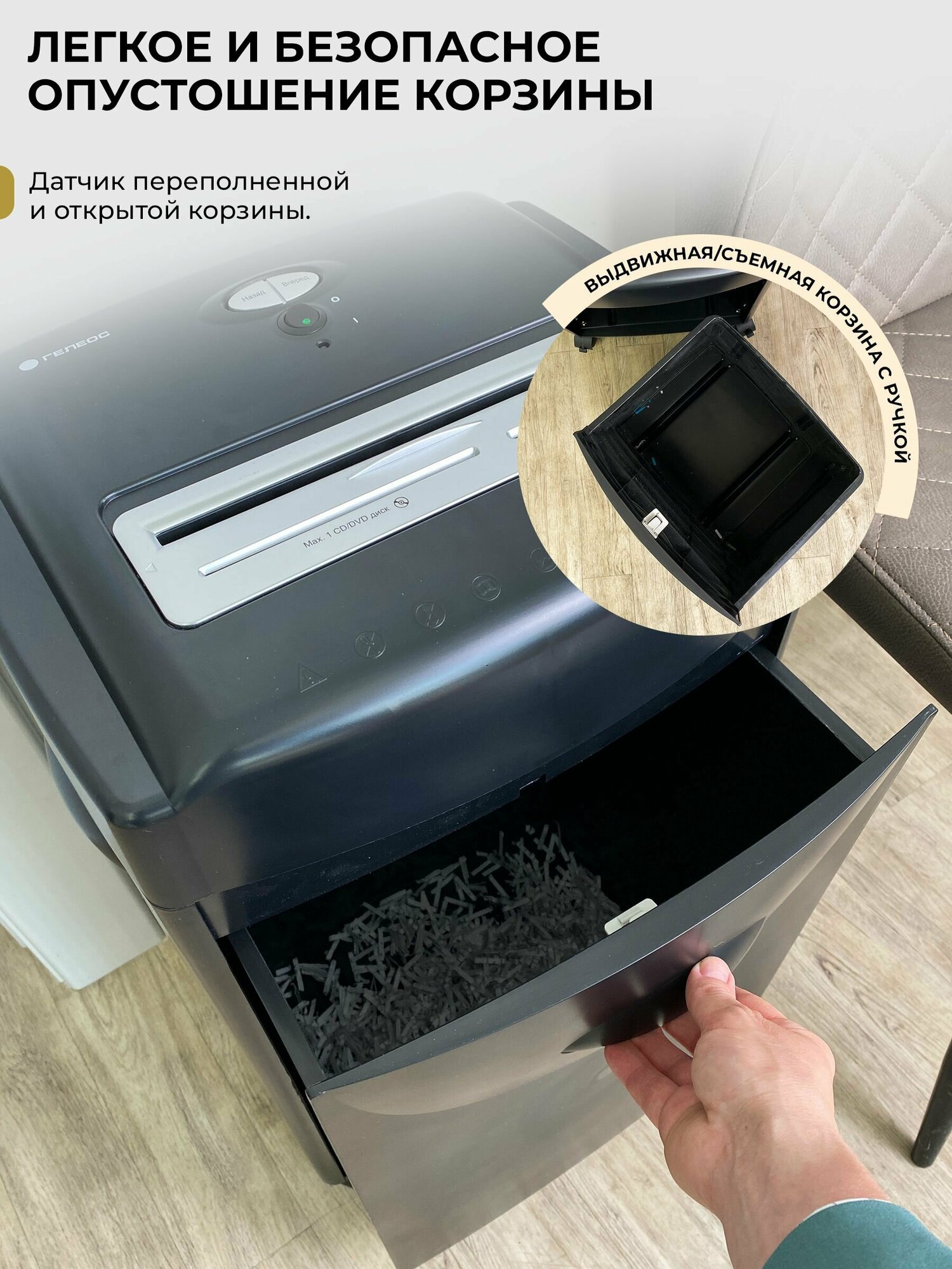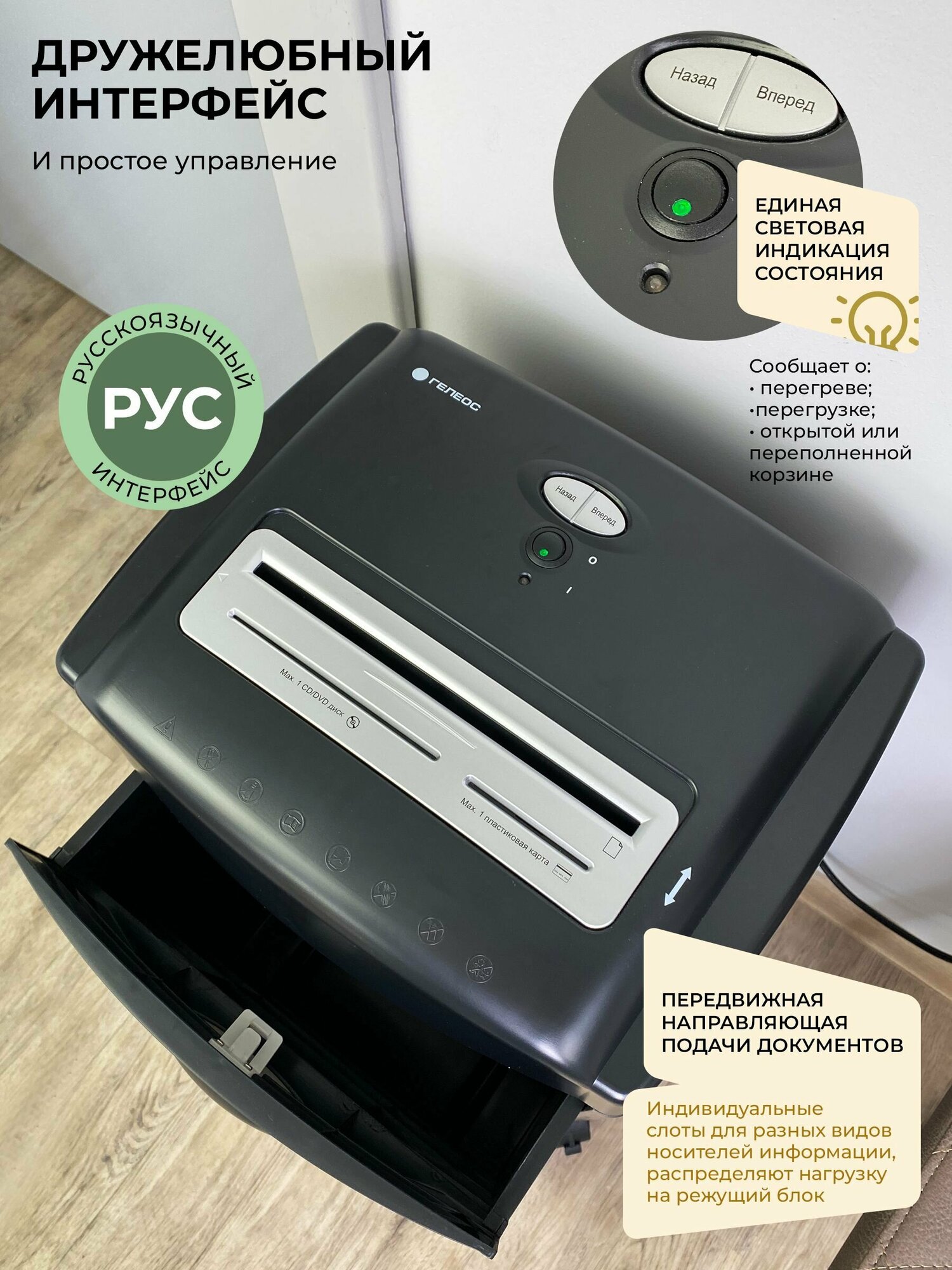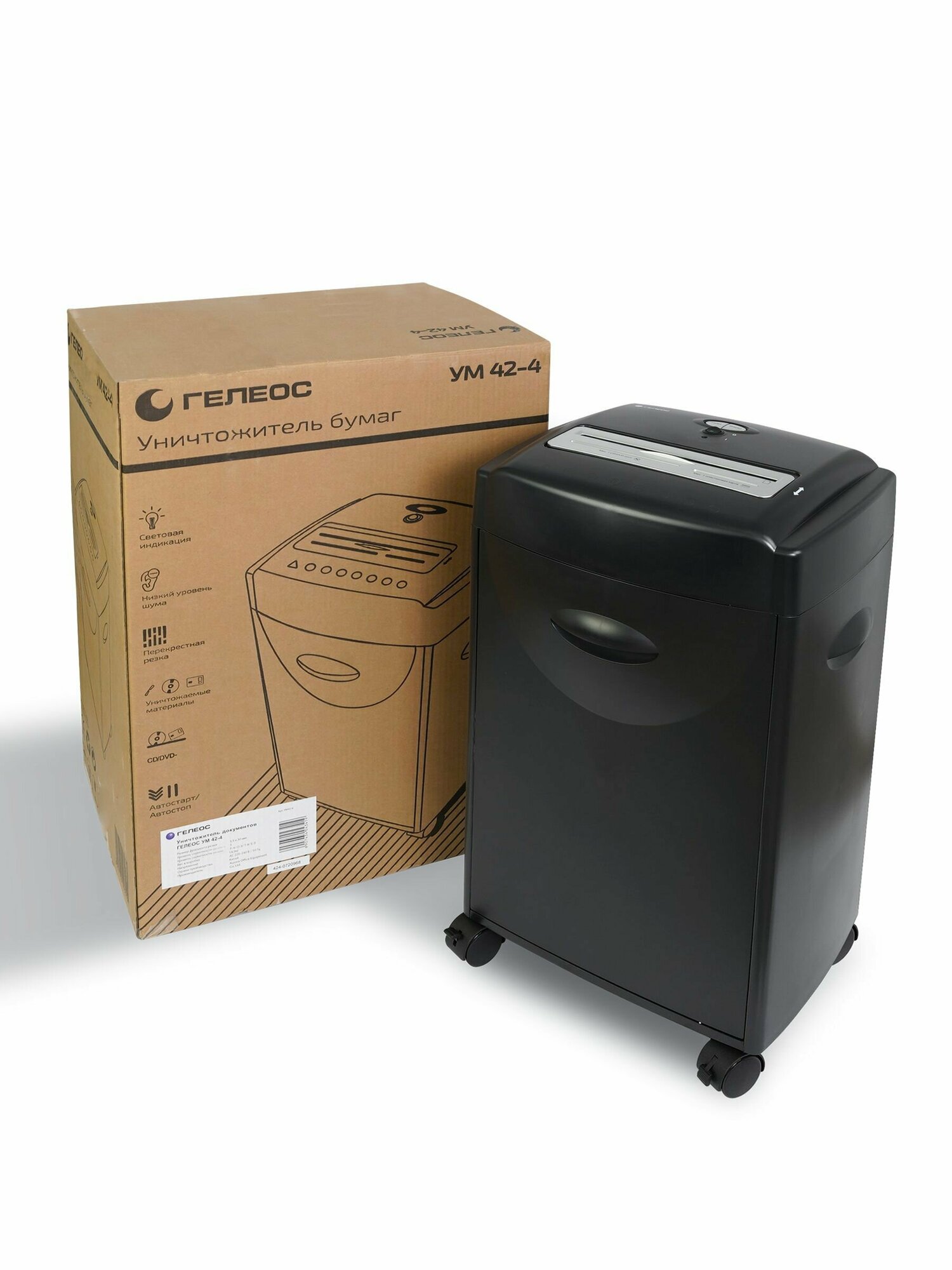 Гелеос Уничтожитель документов гелеос УМ42-4, DIN P-4 (4 ур-нь секр.), фрагмент 3,9х30мм, 18-21 лист (70г/м2), CD/пл.карты/скрепки/скобы, 42 литра