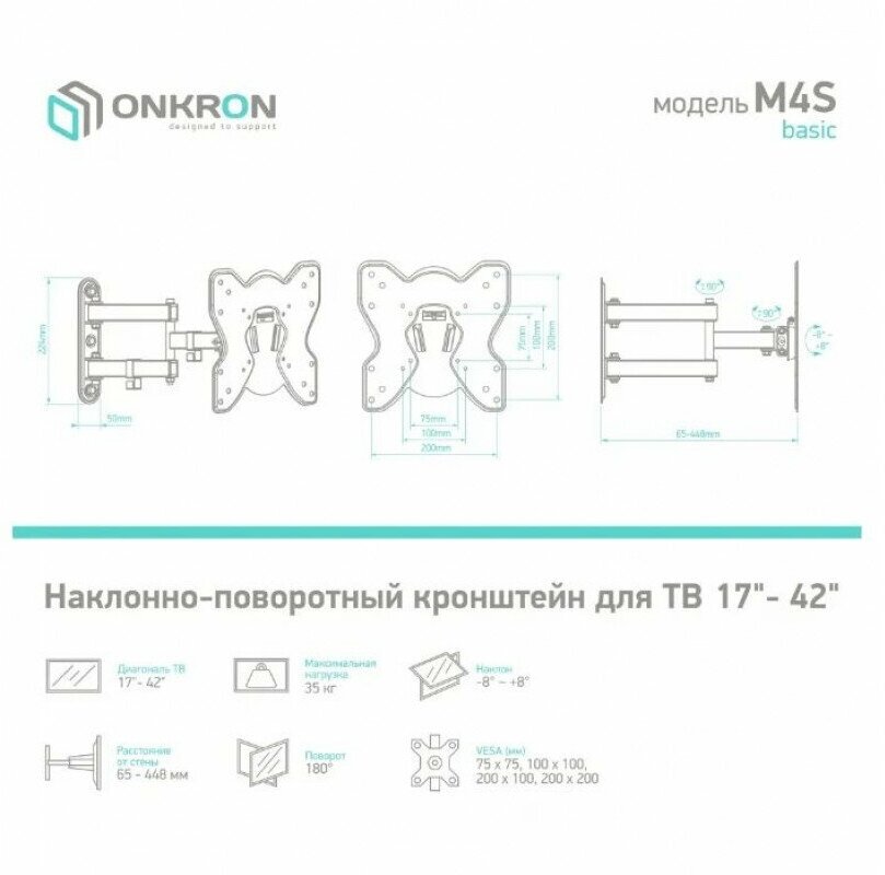 Кронштейн Onkron Basic M4S 17-42" max 35кг VESA 200х200
