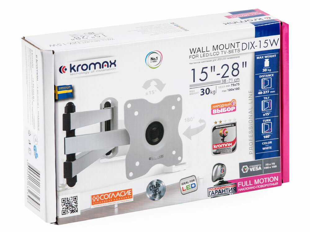 Цена для г. Курчатов. Кронштейн Kromax DIX-15 Белый, Кр. стал. наст. для TV 10"-28", max 30 кг, 5 ст св., нак. ±15°, пов. 180°, от ст. 48-377 мм, max VESA 100x100 мм. Магазины в городе Курчатов смотрите ниже