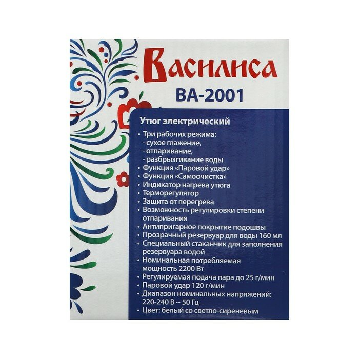 Утюг василиса ВА-2001, 2200Вт, антипригарная подошва, 25 г/мин, 160 мл, бело-сиреневый