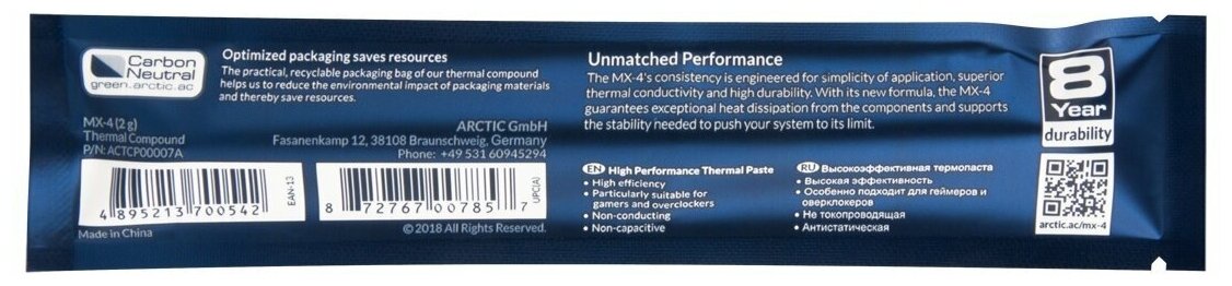 Термопаста ARCTIC MX-4 ACTCP00002B 4г, шприц, теплопроводность 8.5 Вт/мК, вязкость 870 пуаз, плотность 2.5 г/см³