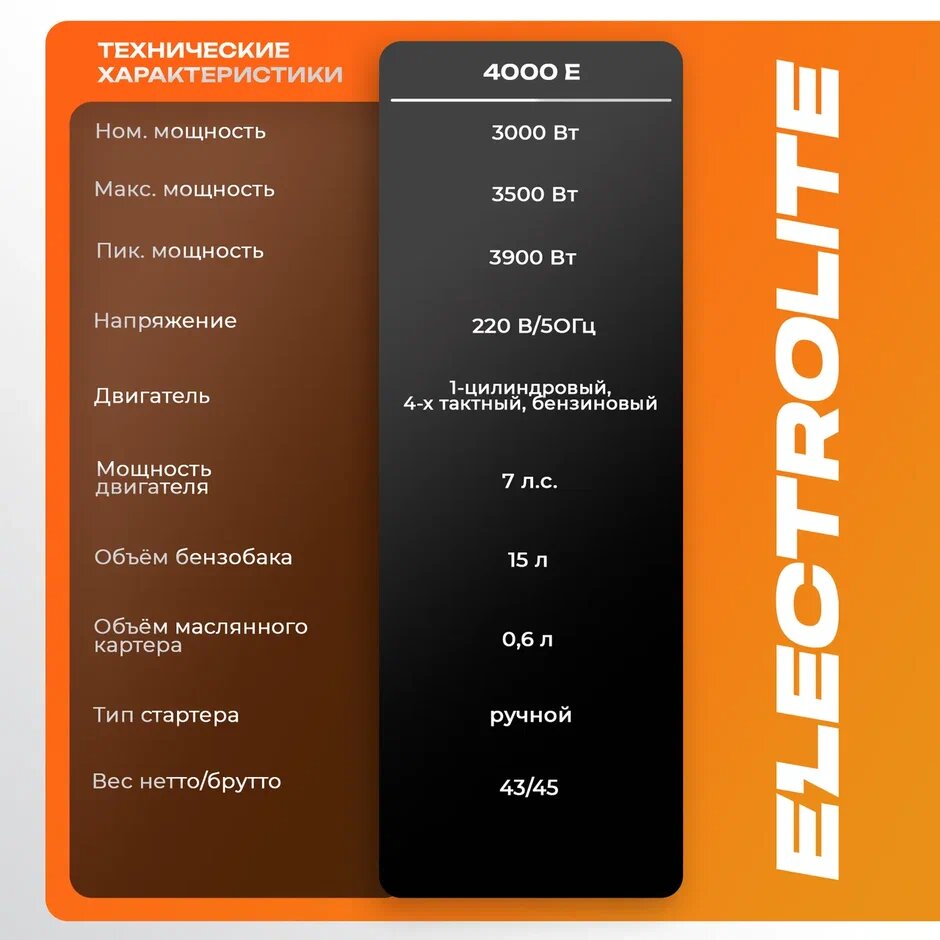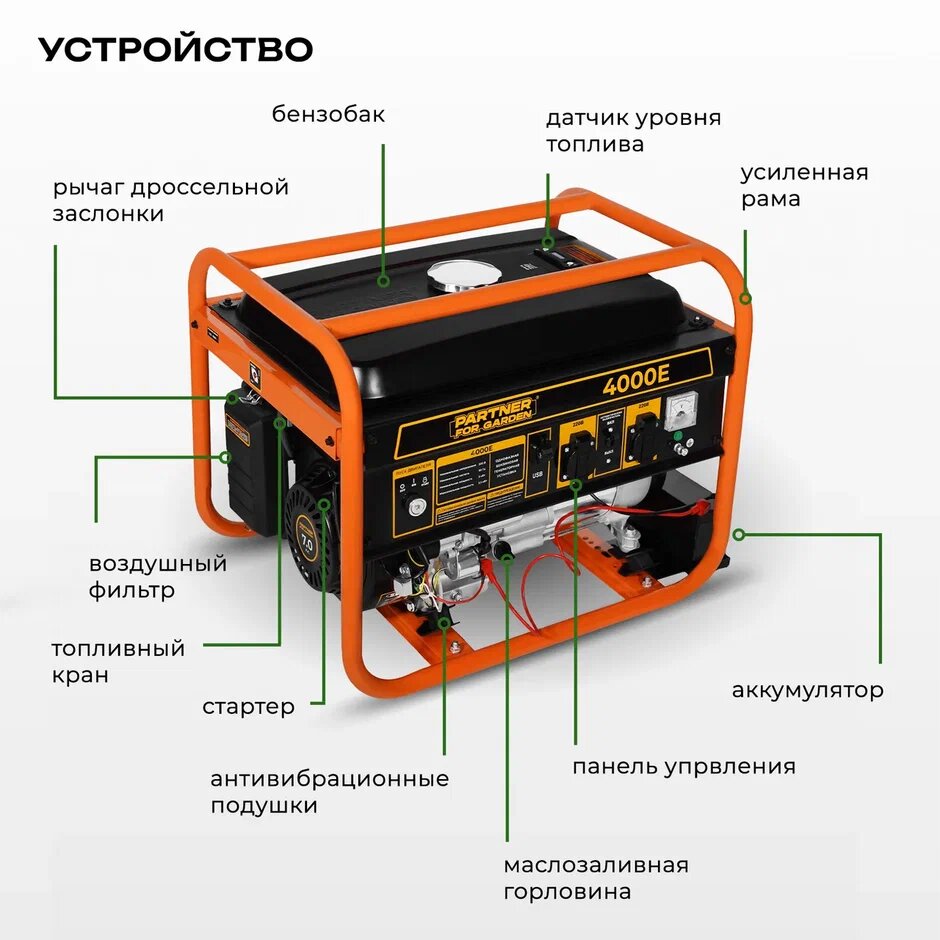 Генератор бензиновый Электрический Partner for garden 4000Е ( 4.875 кВа максимальная нагрузка , 220 В / 12 В, 3 / 3.5 кВт, 50 Гц, 7 л.с, электростартер + АКБ )