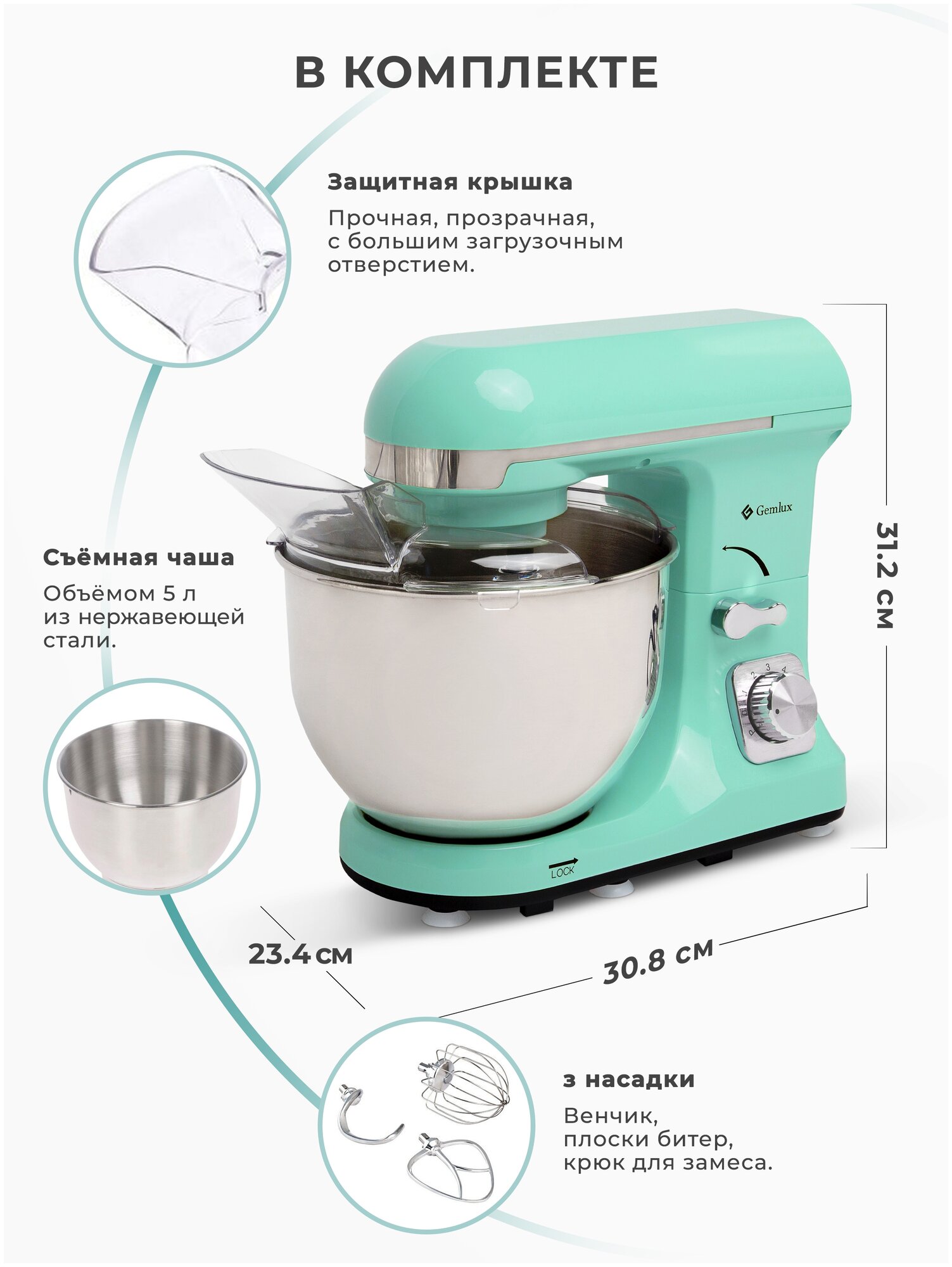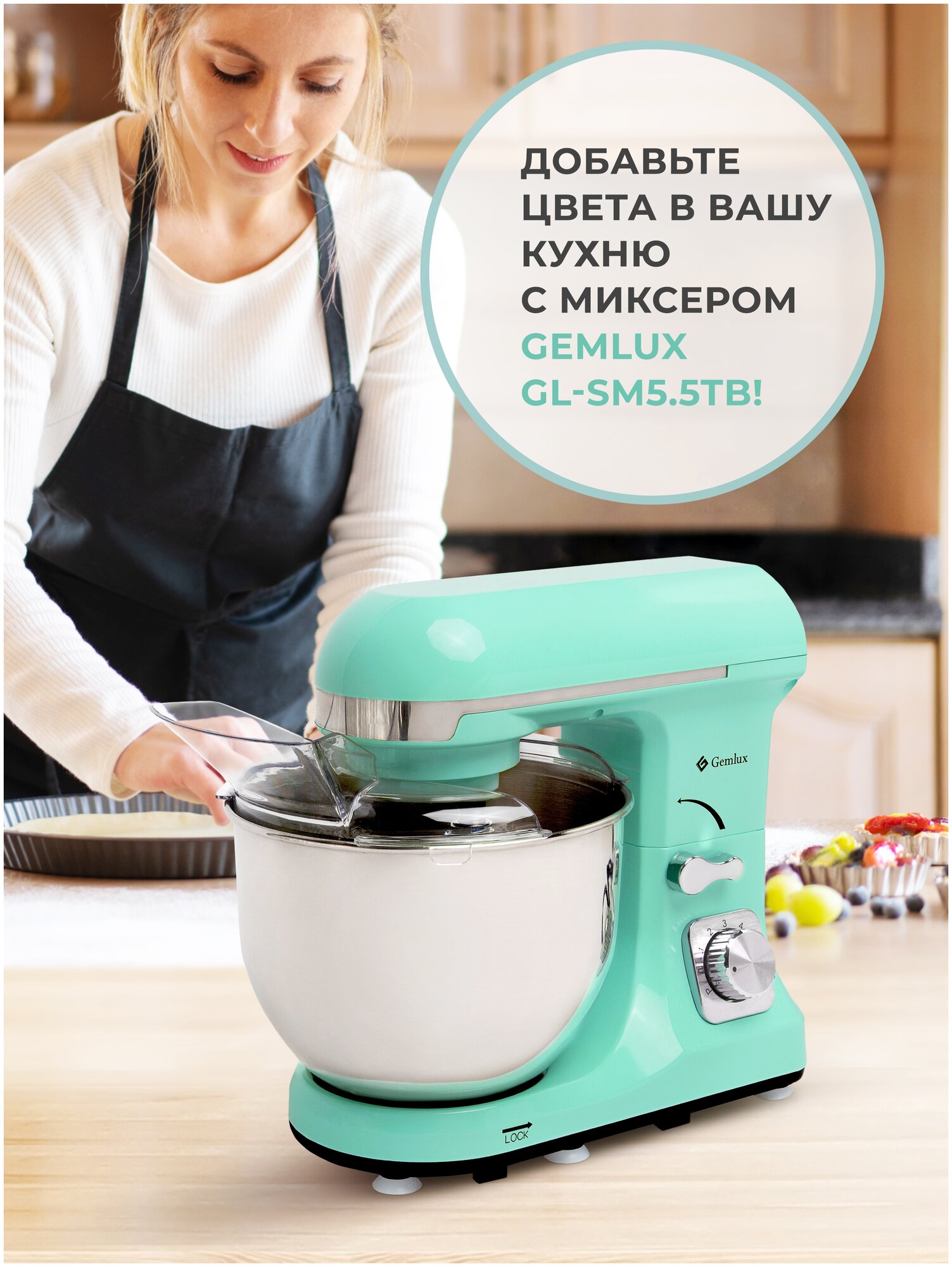 Миксер планетарный GEMLUX GL-SM5.5TB 1000 Вт, мятный
