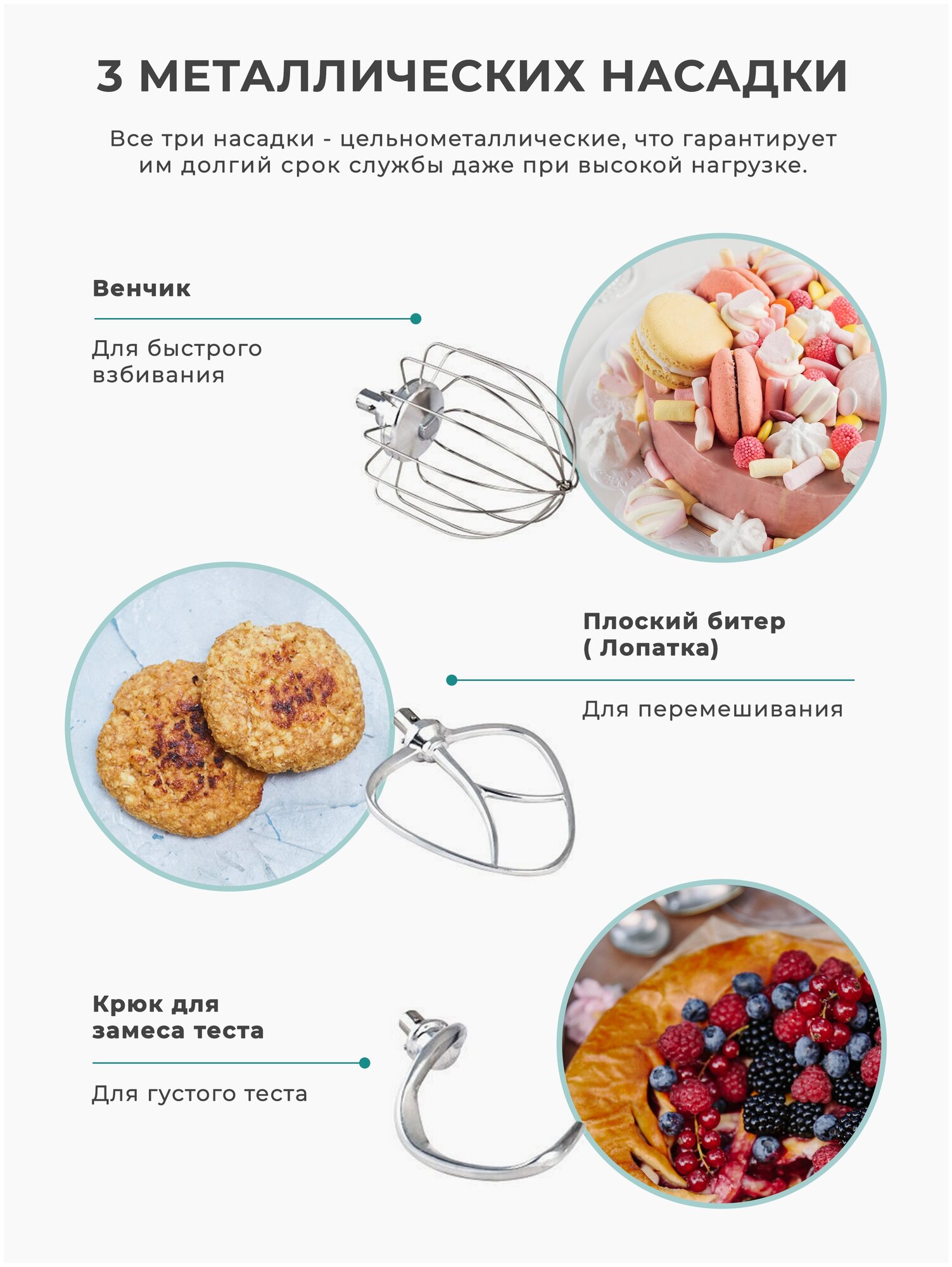 - венчик для взбивания, насадка / крюк для замеса теста, лопатка для перемешивания (биттер)