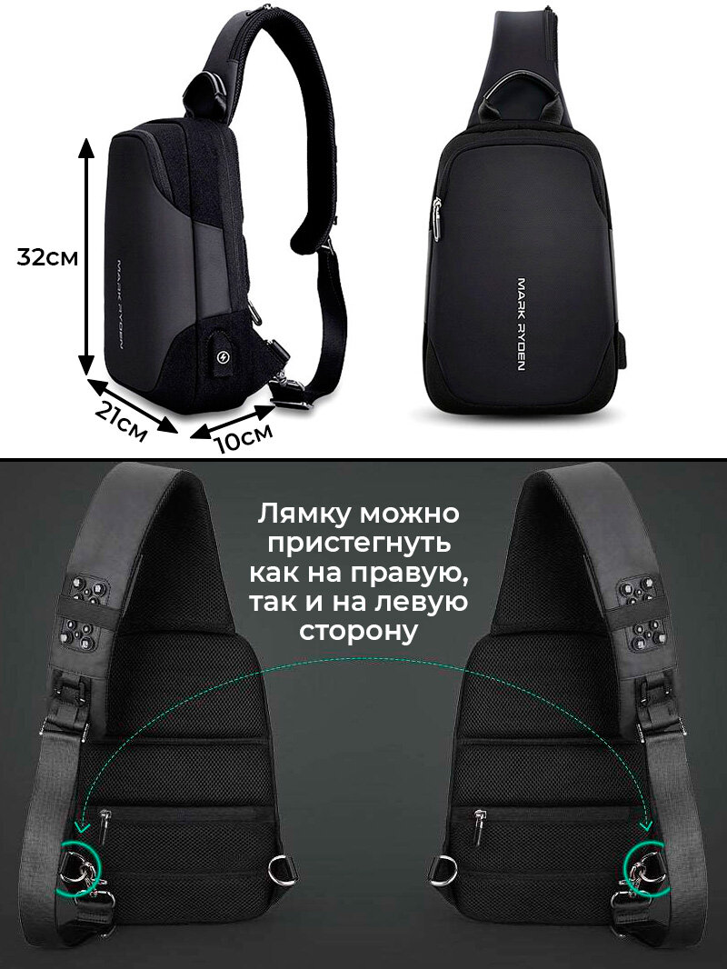 Mark Ryden Рюкзак-сумка слинг мужской через плечо кросс боди Mark Ryden для планшета 9.7", с USB портом и потайным карманом, черный рюкзак в Курчатов