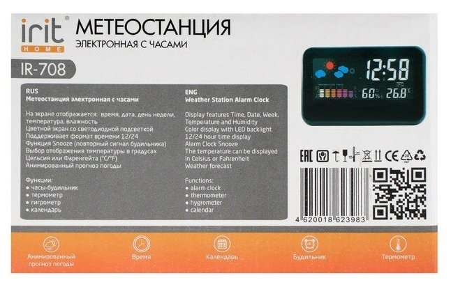 IRIT Метеостанция Irit IR-708, будильник, часы, календарь, термометр, цветной дисплей, 3хААА