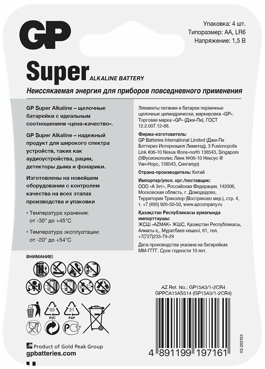 GP / Набор 3 шт Батарейки Alkaline Battery АА 15A LR6 1.5V 4 шт