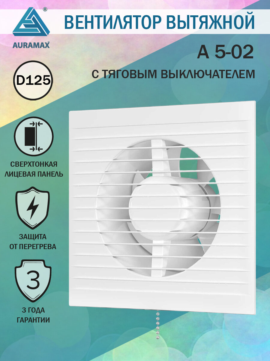 Вентилятор вытяжной осевой AURAMAX A 5-02, с тяговым выключателем, тонкая лицевая панель, D 125 мм, белый