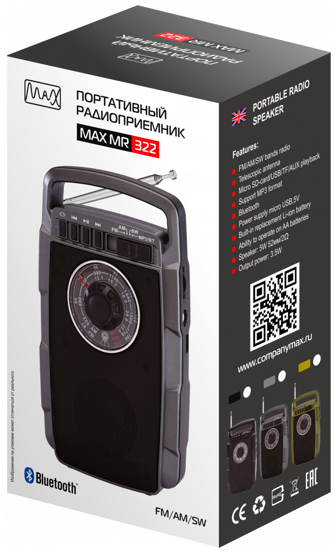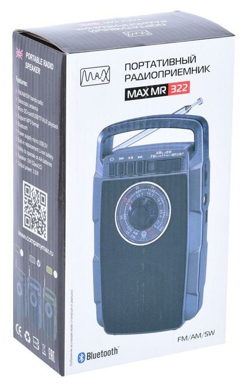 Цена для г. Курчатов. MAX MR-322 отличается компактностью и отличным качеством звука. Прибор размером 18х10,5х5 см и весом 450 г легко взять с собой куда угодно, например на природу. Устройство работает от трёх пальчиковых батарей типа АА (LR-6) или от сети. Девайс располагает модулем Bluetooth и USB-портом, что даёт возможность воспроизводить на нём музыку с телефона или флешки. Для подключения наушников приёмник располагает 3,5-миллиметровым разъёмом. Магазины в городе Курчатов смотрите ниже