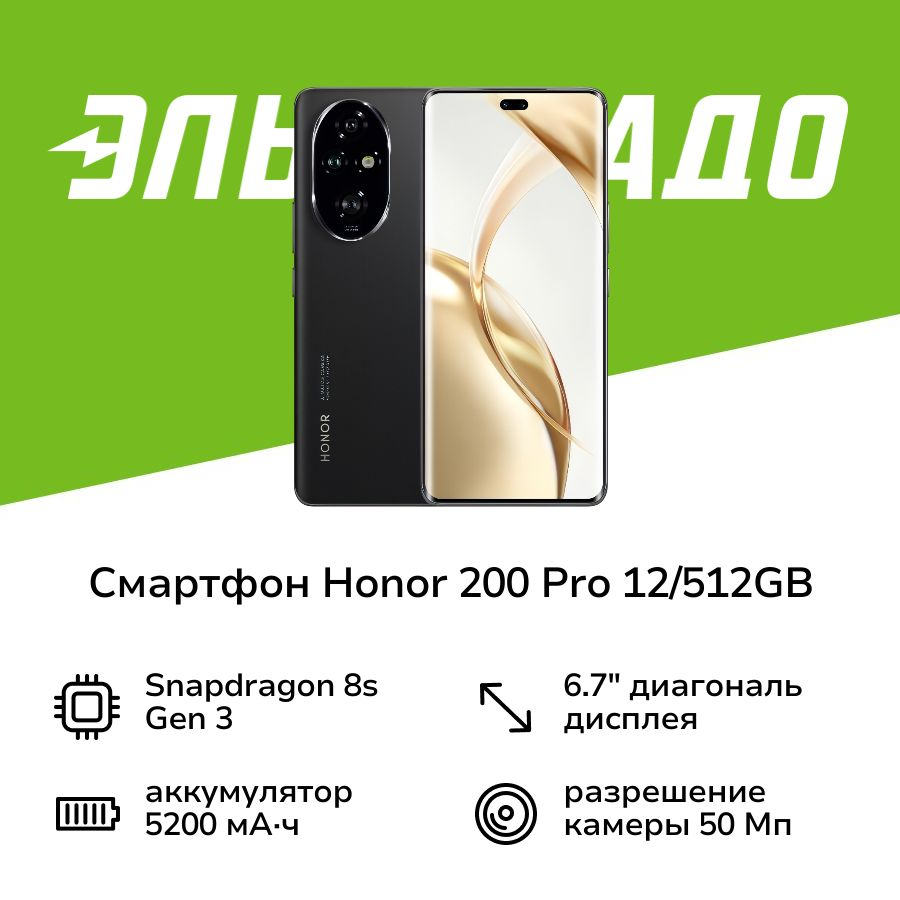 Смартфон Honor 200 Pro, 12ГБ/512ГБ, Black (Черный), OLED, 6.78", 120 Гц, Android 14, RU