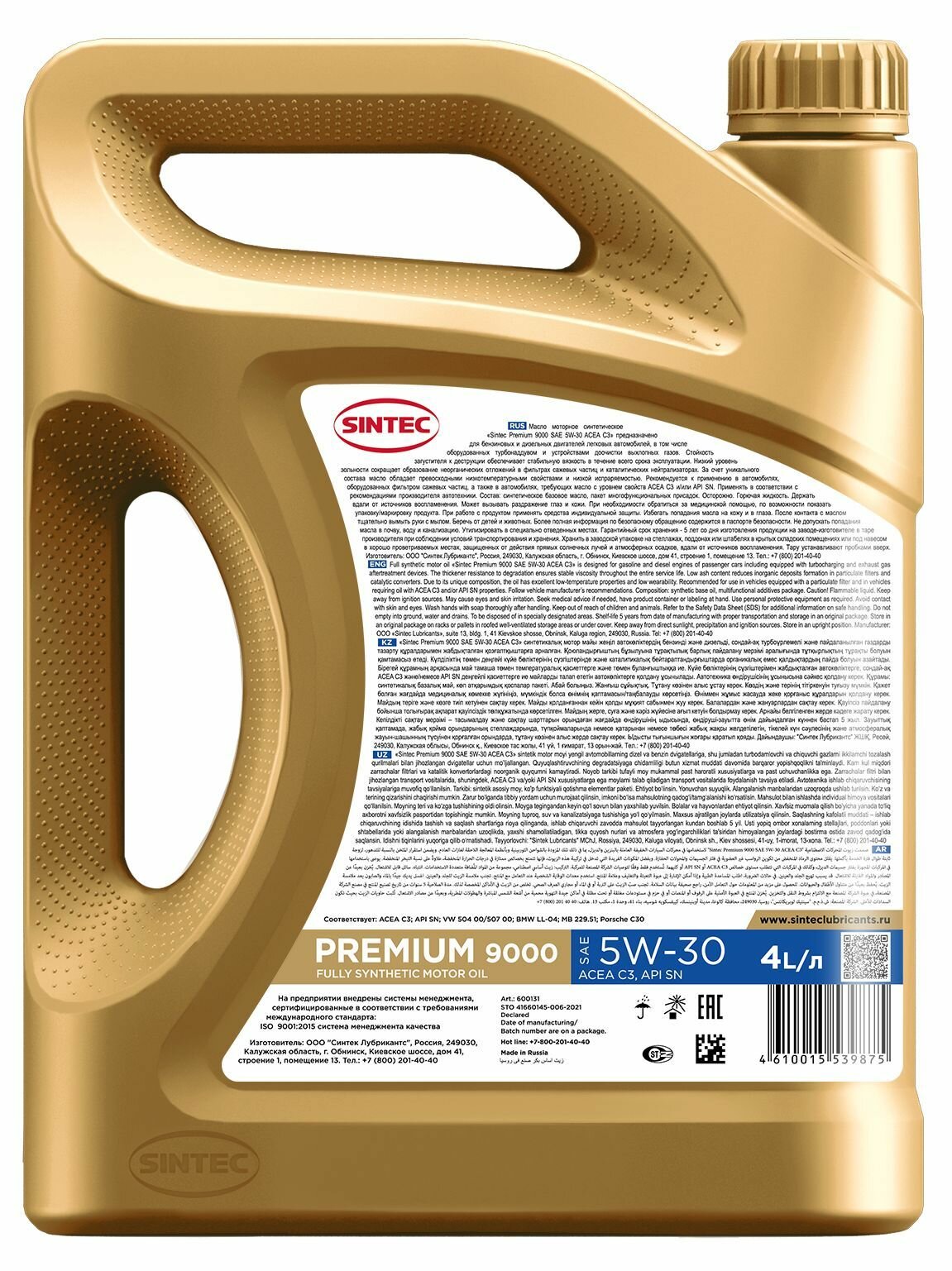 SINTEC 600131 Масло моторное Sintec Premium 9000 5W-30 C3 синтетика 4л 600131