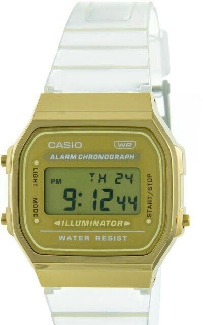 A168WEGG-1A Casio наручные часы кварцевые WR30 (3 атм) мужские, женские черный секундомер будильник отображение числа, отображение дня недели, отображение месяца подсветка дисплея акриловое стекло