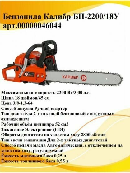 Бензопила калибр БП-2200/18У (2200Вт/3,0л.с., шина 18"(450мм), цепь 3/8"/1,3мм/64 зубъев)