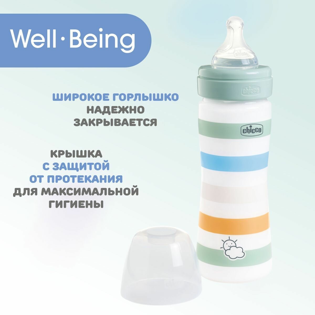 Chicco Бутылочка для кормления CHICCO Well-Being Boy 2мес.+,сил.соска средн.поток,РР,250мл.,зеленая бутылочки и поилки в Курчатов