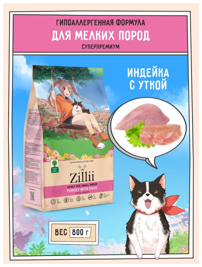 Корм для собак сухой мелких пород 800 г, гипоаллергенный ZILLII (Зилли), Индейка с Уткой