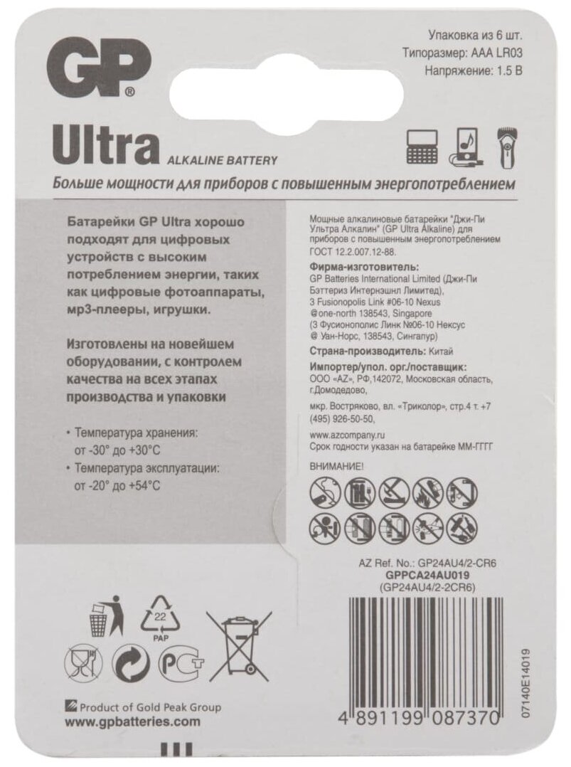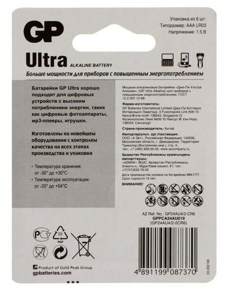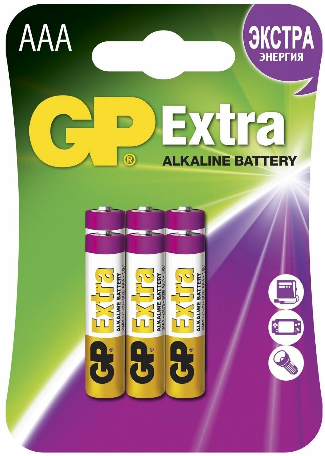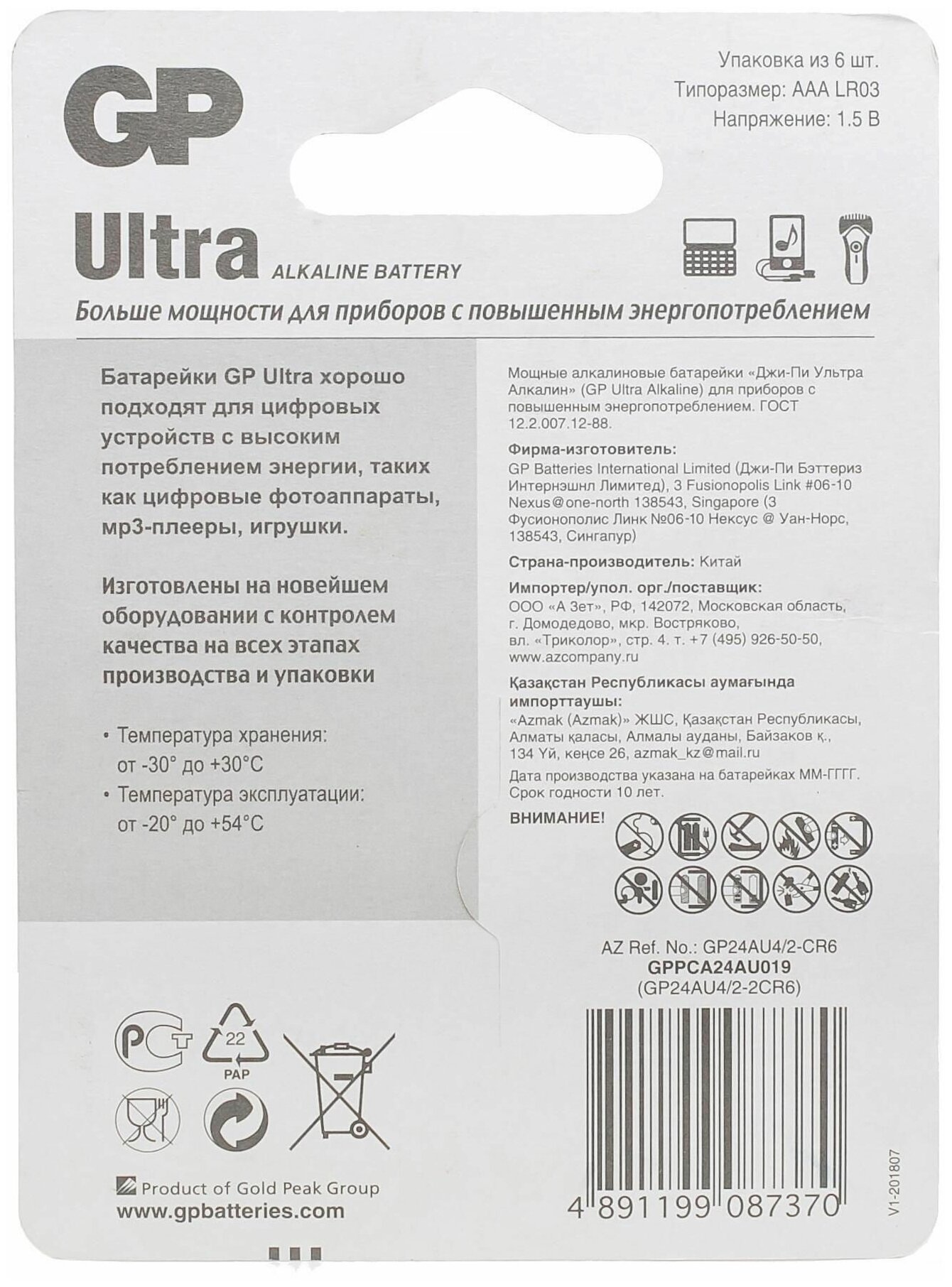 Батарейки GP Ultra AAА, PCA24AU019, алкалиновые, 6 шт (24AU4/2-2CR6 Ultra)