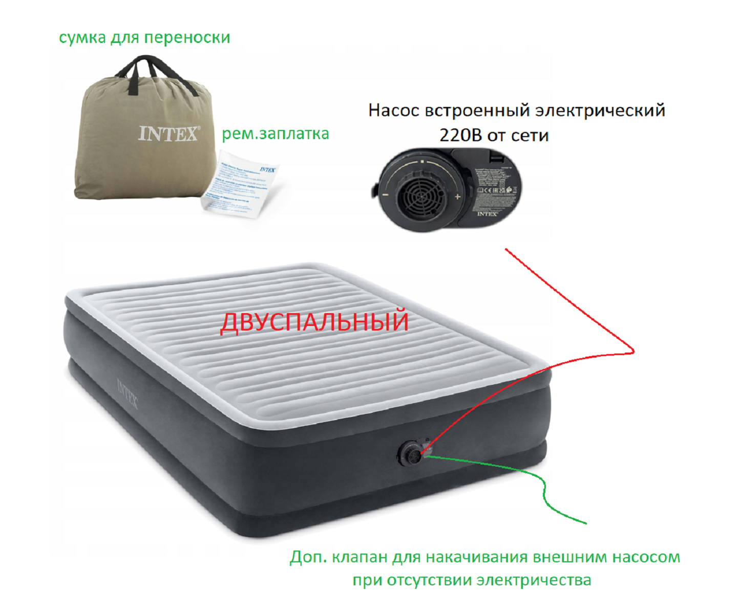 Двуспальная кровать Intex Comfort-Plush Elevated Airbed (Queen), 152х203х46 см, со встроенным насосом 220, 64414