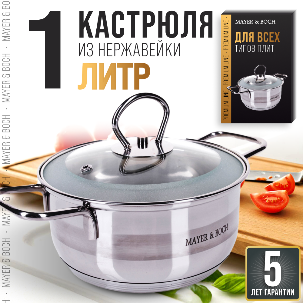 Кастрюля из нержавеющей стали Mayer&Boch / Майер Бош MB25406 с ручками и крышкой 1000мл / посуда для всех видов плит