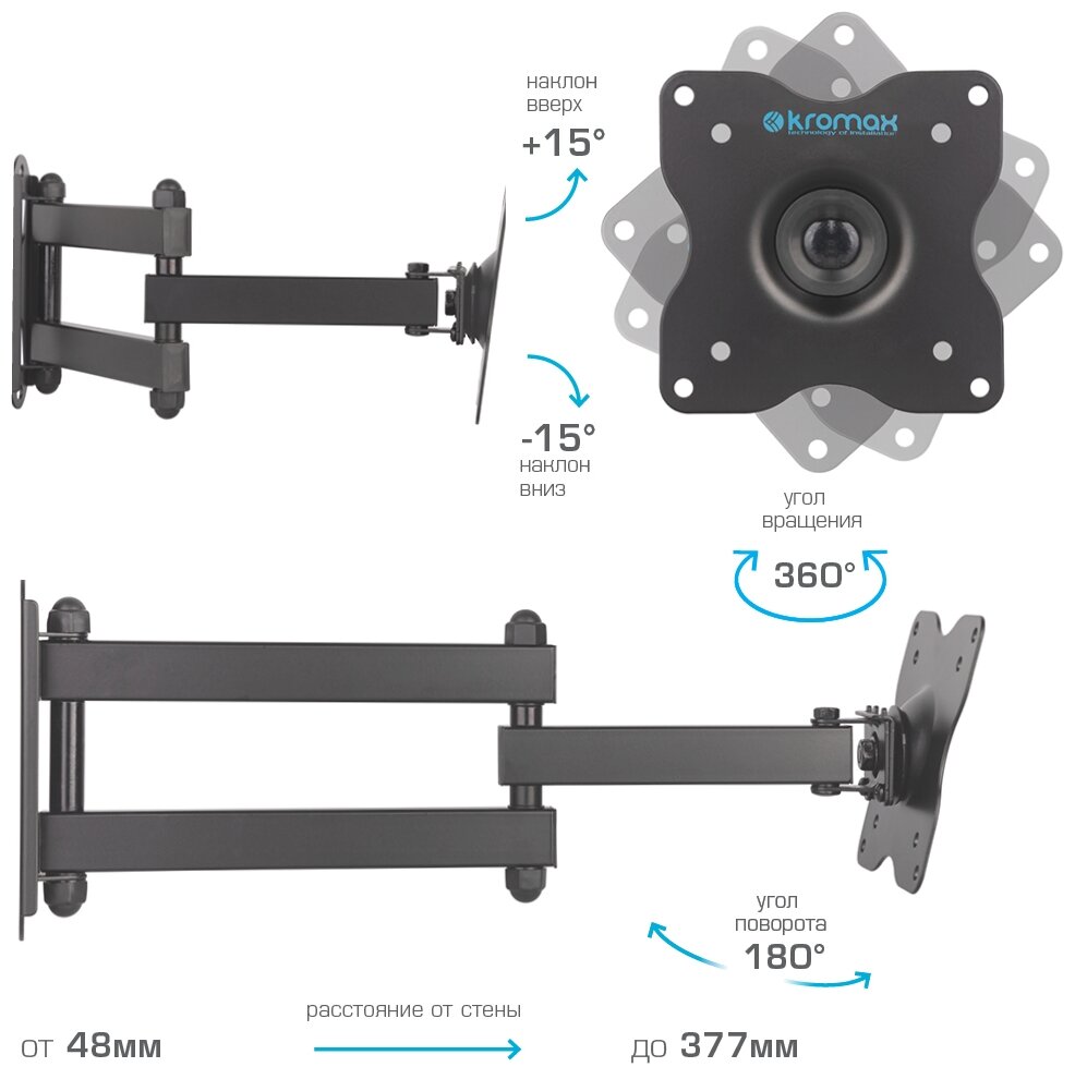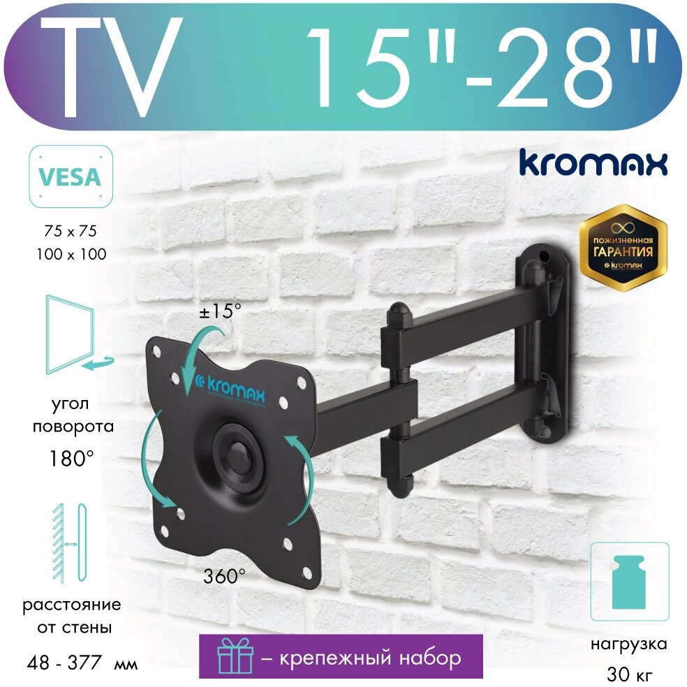 Кронштейн Kromax DIX-15, для ТВ, наклонно-поворотный, 15-28", 48-377 мм от стены, черный